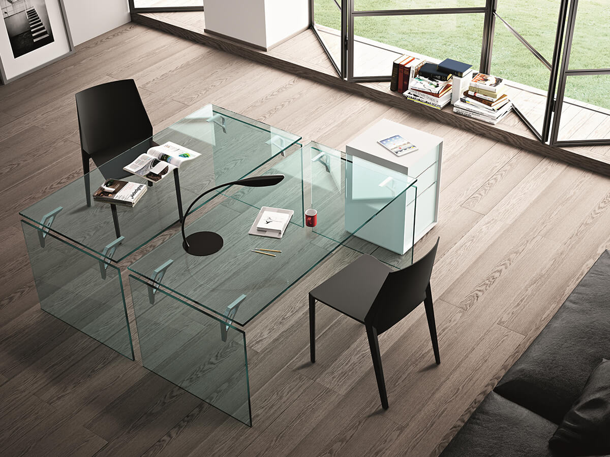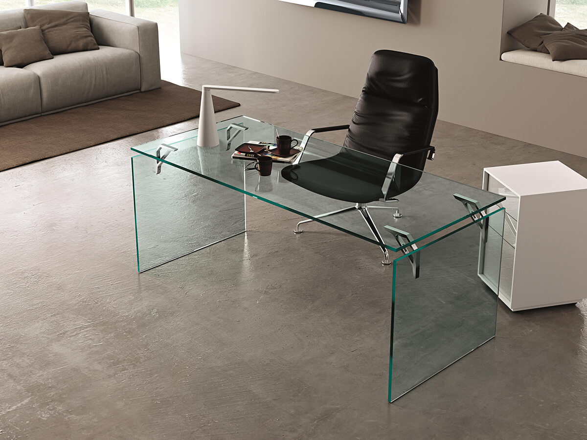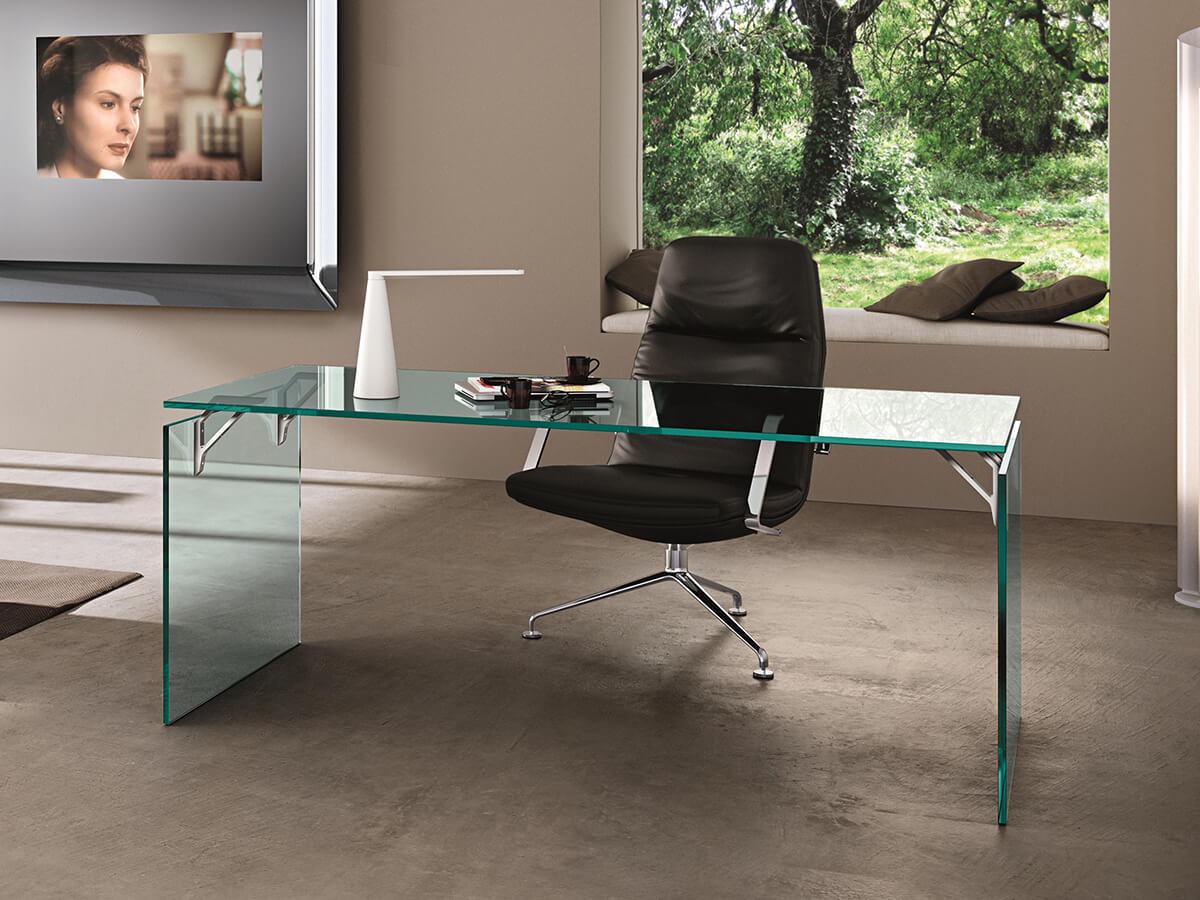Eleganza e design si intrecciano in questo peculiare oggetto nato dal genio creativo di Valerio Cometti. Come molte altre opere di Fiam, Bright conserva l’essenziale trasparenza del vetro e vi aggiunge un tocco squisitamente personale, capace di esaltare le forme e ravvivare le superfici. Il vetro temperato da 15 mm che compone questa scrivania è smontabile e presenta supporti di fissaggio in alluminio e acciaio, perfetti per garantire resistenza e durabilità nel tempo. È possibile anche averla su misura, così da garantire massimo comfort in qualunque ambiente. Ideale per uffici, studi e spazi formali, questo elemento d’arredo non teme soluzioni più diversificate, sposando stili contemporanei o più retrò a seconda della necessità.