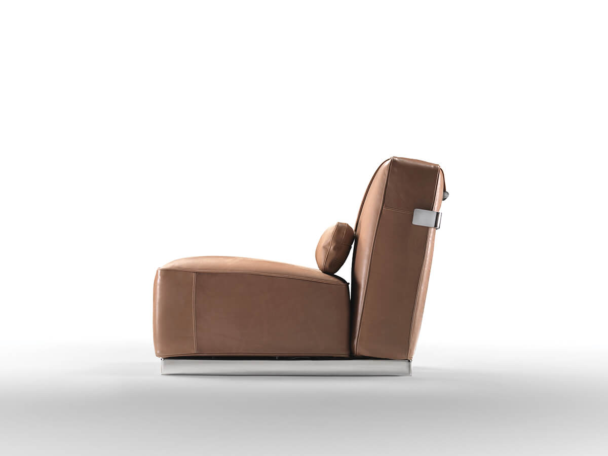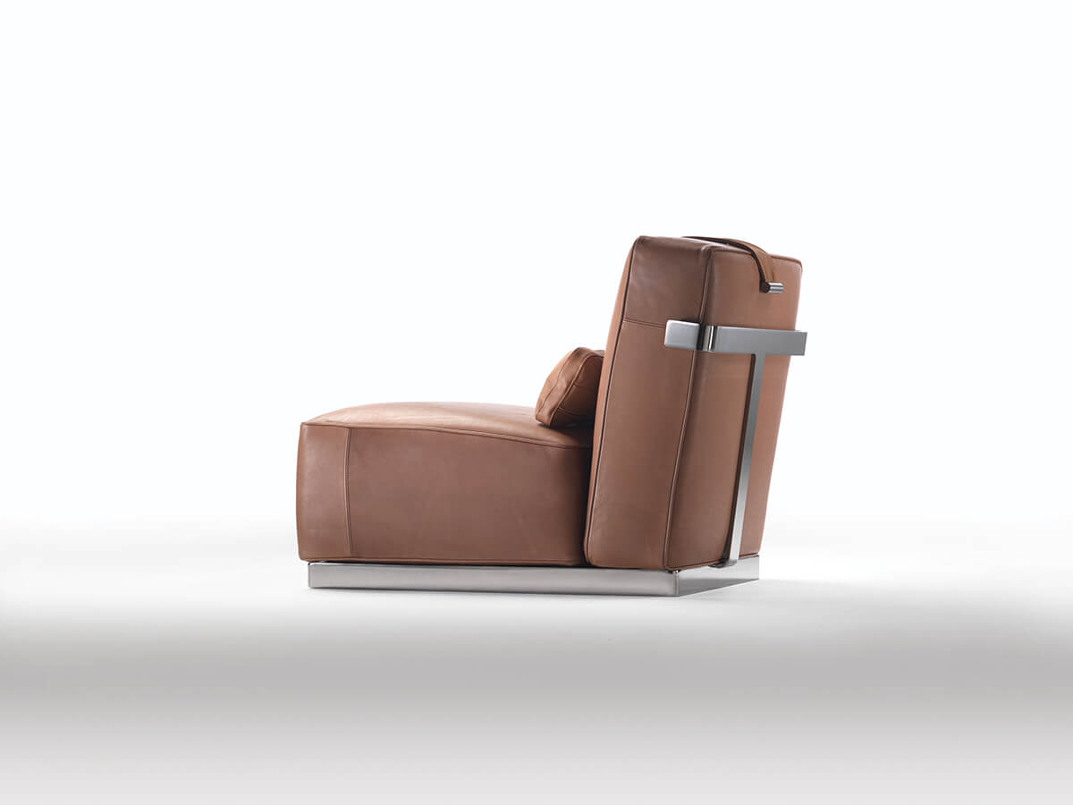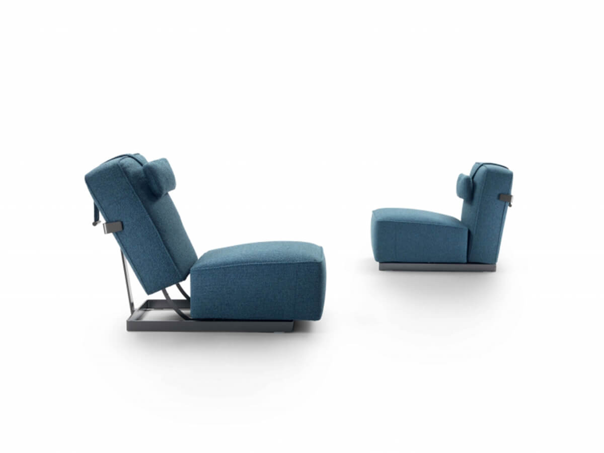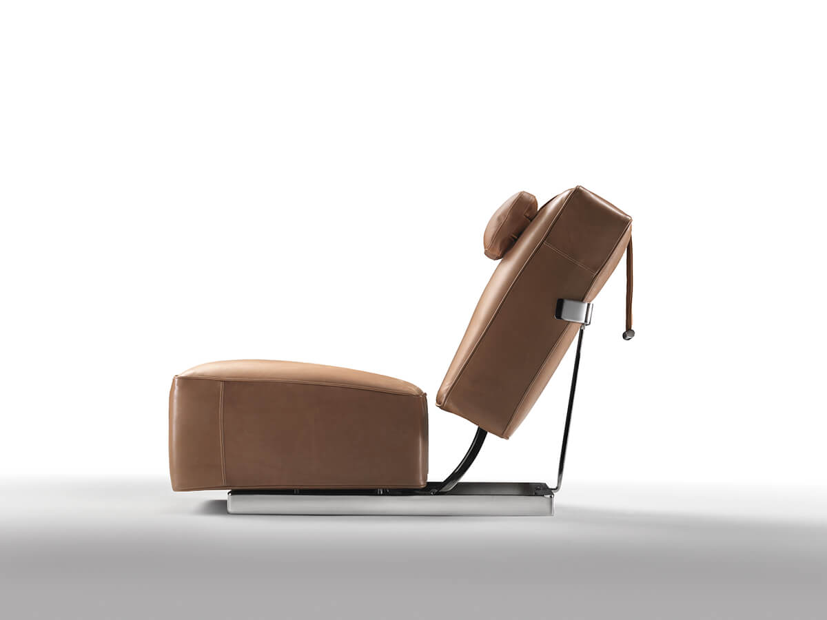 Un omaggio al Movimento Moderno, nato dalla grande ispirazione di Antonio Citterio e guidato verso forme e progettualità attuali dalla qualità artigianale Flexform. L’impiego della pelle nera e la struttura in tubolare metallico evidenziano il solido ancoraggio che A.B.C ha verso un illustre passato. Contemporanea è invece la seduta bassa che determina una perfetta integrazione dei volumi imbottiti all’interno della struttura portante, disponibile in diverse finiture. Completa di pouf poggiapiedi, A.B.C è garanzia di comodità. La riedizione A.B.C presenta un disegno diverso della base e l’eliminazione del bracciolo che conferisce un aspetto più morbido alla struttura in generale. Accessorio opzionale è il cuscinetto poggiatesta con imbottitura in piuma d’oca per una ancora più accentuata sensazione di comodità. *Caratteristiche tecniche: tutte le versioni della poltrona sono con movimento