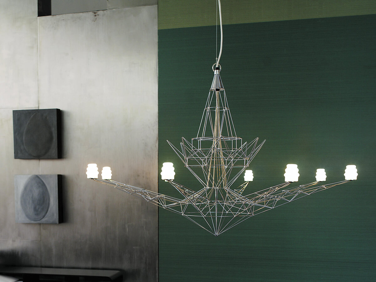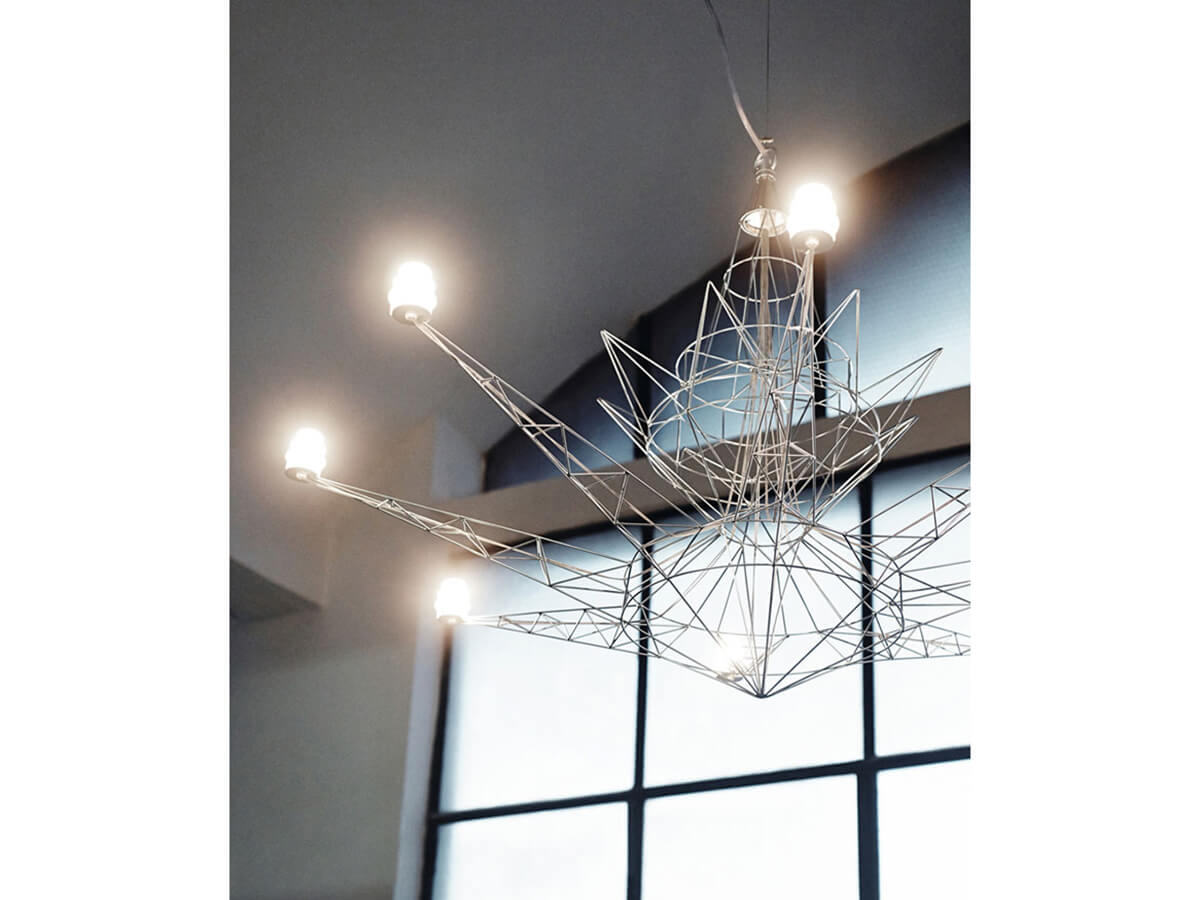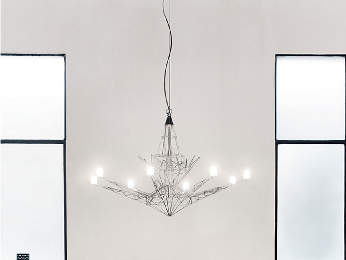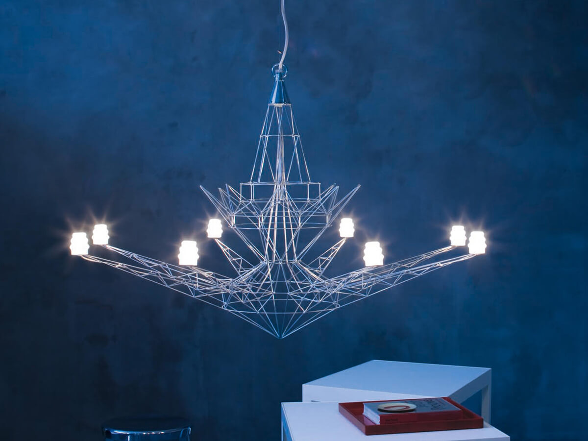 La lampada a sospensione Lightweight di Foscarini è un sorprendente “chandelier scarnificato” che riprende le forme dei ricchi e preziosi lampadari in vetro di Murano ma le riduce a un sottile scheletro metallico. Nell’operazione, concepita dall’inventivo designer inglese Tom Dixon, il lampadario non perde la sua raffinata eleganza, esaltata anzi dalla leggerezza impalpabile della struttura. Il processo produttivo della lampada Lightweight è parzialmente artigianale e prevede la saldatura manuale di centinaia di elementi in tondino metallico che danno vita a otto lunghi bracci sormontati da piccoli diffusori in vetro soffiato trasparente che si rilevano in grado di spandere una luce intensa in tutto l’ambiente.