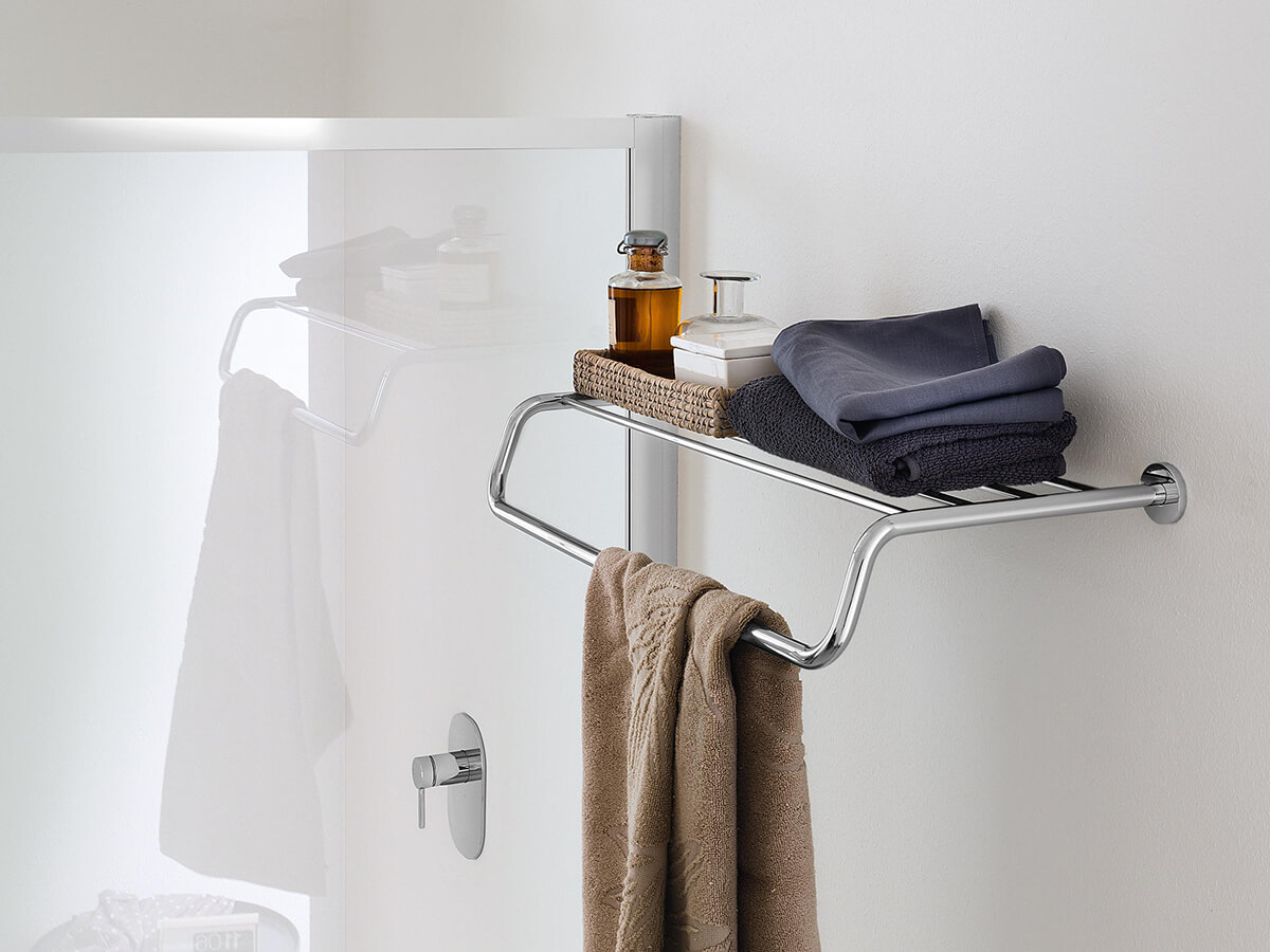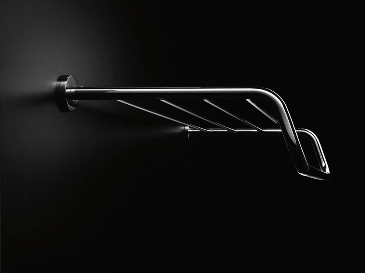 La serie di accessori One di Inda porta la firma di un grande architetto e designer italiano, Matteo Thun, assistito da Antonio Rodriguez, che dà vita a una linea composta di elementi di estrema semplicità formale dagli angoli dolcemente spettacolare in cui tutto il ruolo emozionale è lasciato alla forza del materiale. Gli elementi della serie One sono disponibili infatti in diverse finiture, dal nickel spazzolato a una neutra verniciatura opaca bianca oppure nera, dalla scintillante versione cromata fino alle lussuosissime finiture in oro rosato lucido o dorata a 24 carati. La serie One si propone di una vasta serie di elementi (portasapone, portarotolo, ganci appendiabiti, scopini e molto ancora), di cui qui proponiamo in evidenza le pratiche barre porta salviette e portateli con aggancio a parete.