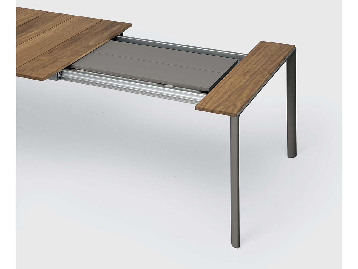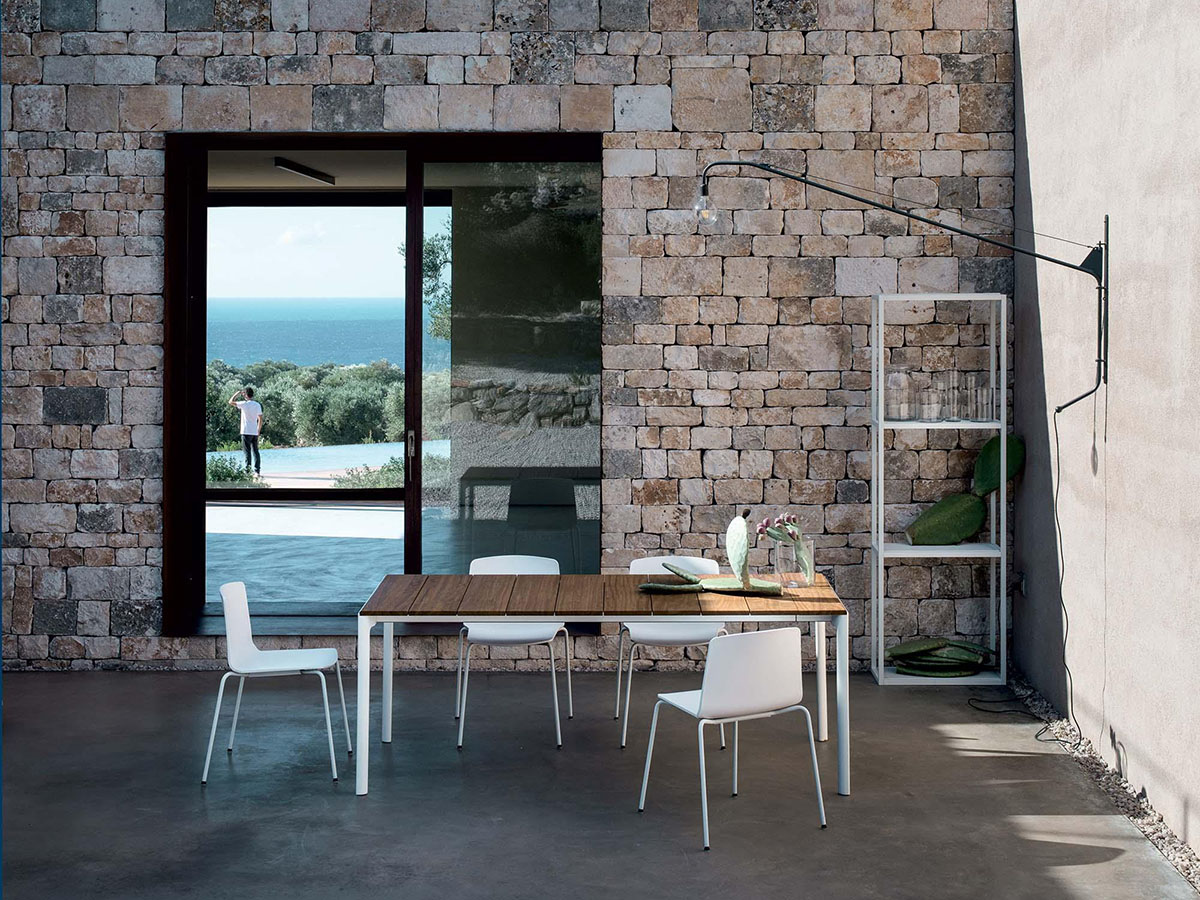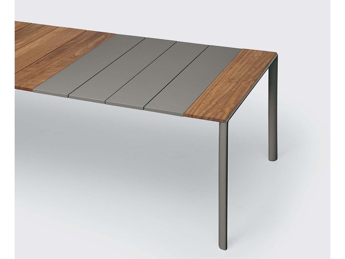 Maki Slatted è un tavolo da esterno progettato dal prestigioso studio Bartoli Design e prodotto dal brand Kristalia. La struttura, dalle linee minimal, è interamente in alluminio disponibile in diversi colori mentre il piano è in doghe di teak trattato con olio oppure lasciato al naturale e proveniente da foreste certificate FSC. Nella versione allungabile il tavolo è provvisto di prolunghe in trafila di alluminio dello stesso colore della struttura che trovano posto nel vano sottostante al piano. Maki Slatted è un tavolo molto versatile, grazie anche alle numerose dimensioni disponibili, ed arreda con semplicità ed eleganza gli spazi esterni di residenze private ma può essere utilizzato anche in progetti di contract.