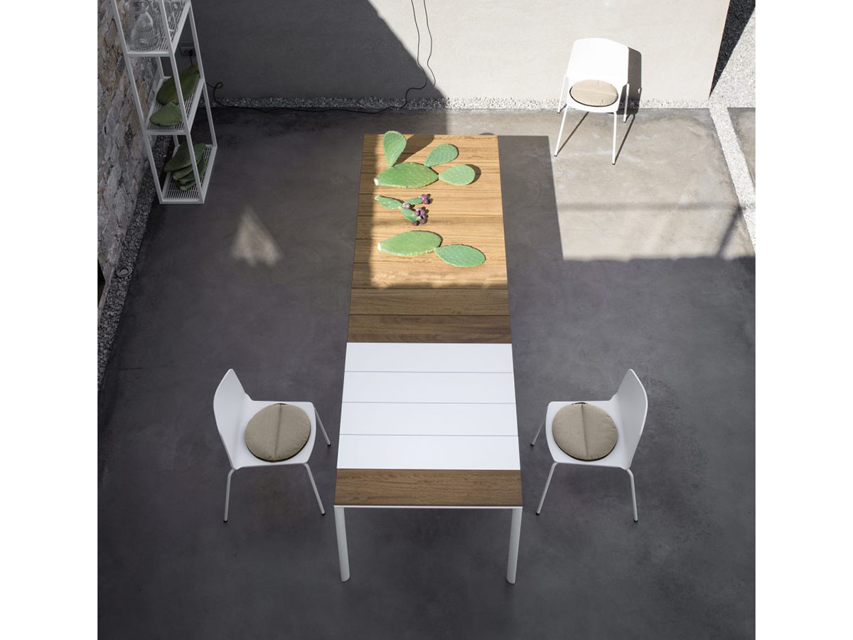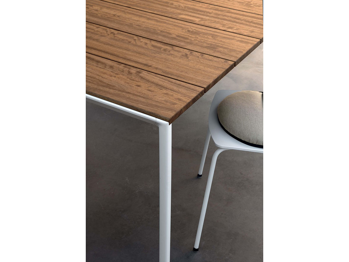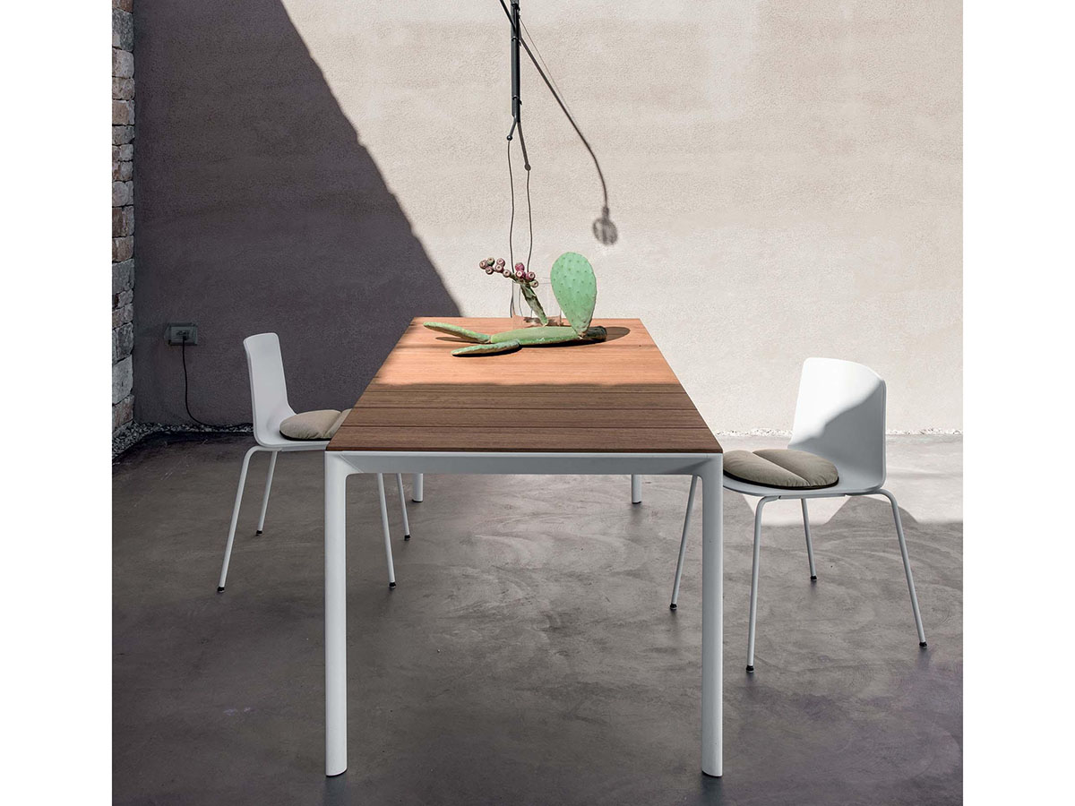 Maki Slatted è un tavolo da esterno progettato dal prestigioso studio Bartoli Design e prodotto dal brand Kristalia. La struttura, dalle linee minimal, è interamente in alluminio disponibile in diversi colori mentre il piano è in doghe di teak trattato con olio oppure lasciato al naturale e proveniente da foreste certificate FSC. Nella versione allungabile il tavolo è provvisto di prolunghe in trafila di alluminio dello stesso colore della struttura che trovano posto nel vano sottostante al piano. Maki Slatted è un tavolo molto versatile, grazie anche alle numerose dimensioni disponibili, ed arreda con semplicità ed eleganza gli spazi esterni di residenze private ma può essere utilizzato anche in progetti di contract.
