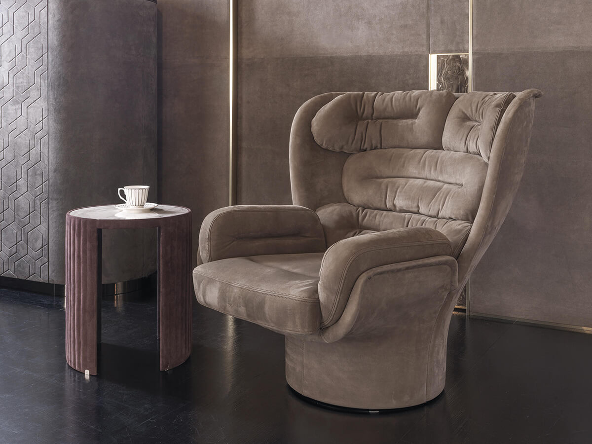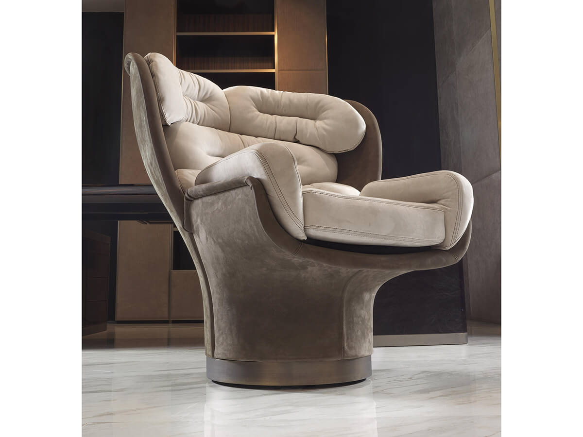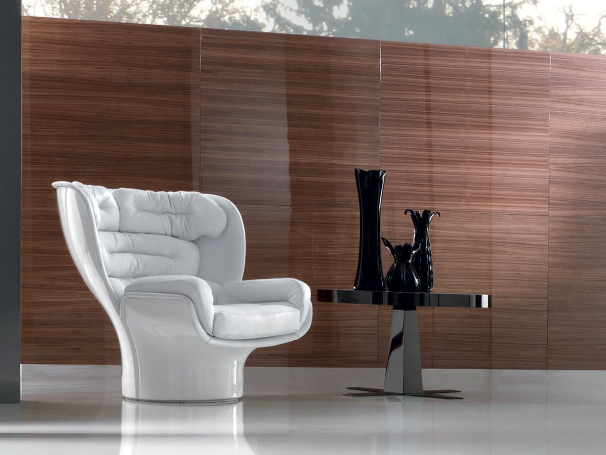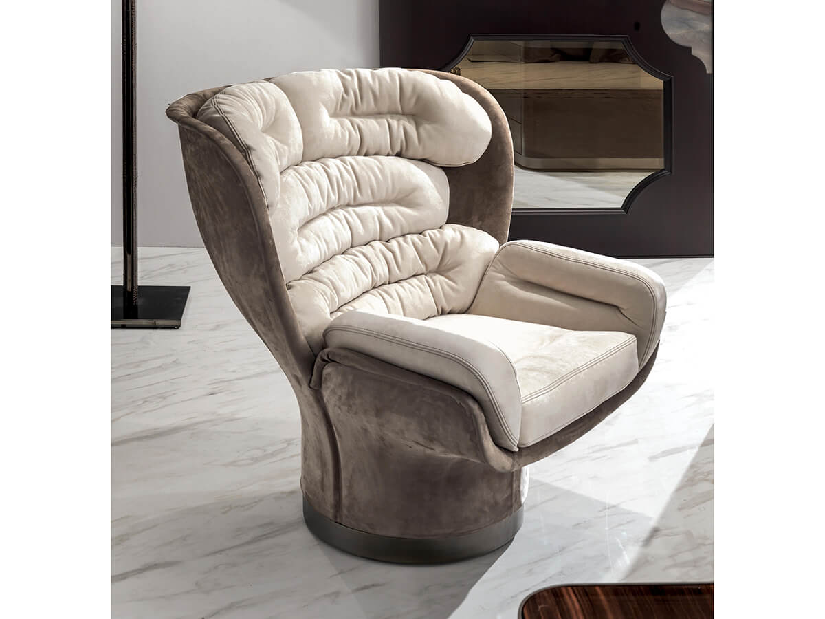 Un design avveniristico si sposa ad una ricerca progettuale senza precedenti, finemente orchestrata affinché la poltrona Elda di Longhi garantisca il massimo comfort e gradevolezza estetica. La struttura di Elga è girevole a 360°, in fiberglass lavorata come da progetto originale in stampi grazie ad una tecnica completamente manuale. Le imbottiture in poliuretano espanso sono ricoperte in Dacron per una migliore comodità. I rivestimenti sono disponibili sia in pelle che in tessuto e grazie alla particolare lavorazione di Elda, sono interamente sfoderabili. I colori della scocca esterna in fiberglass spiccano per varietà ed eleganza, adattabili a diversi contesti living, dining e notte, a seconda del gusto.