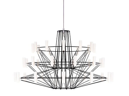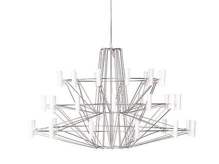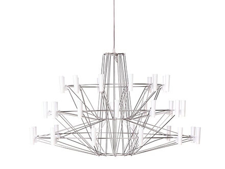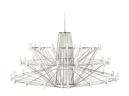 La lampada a sospensione Coppélia è uno chandelier leggero ed elegante che trae la sua ispirazione dal mondo del balletto. Prende infatti il suo nome da una famosa pièce coreografica francese di fino Ottocento e cerca di ricreare nelle sue forme l’impressione di sinuosa impalpabilità dei movimenti di una ballerina. Dozzine di luci a led inserite in piccoli diffusori cilindrici vengono disposte su tre livelli e agganciati all’etera scultura metallica composta da sottili tondini che fungono anche da conduttori di corrente permettendo l’accensione dei led. La lampada Coppélia, con il suo look magico e impalpabile, porta la firma del designer giapponese Arihiro Miyake