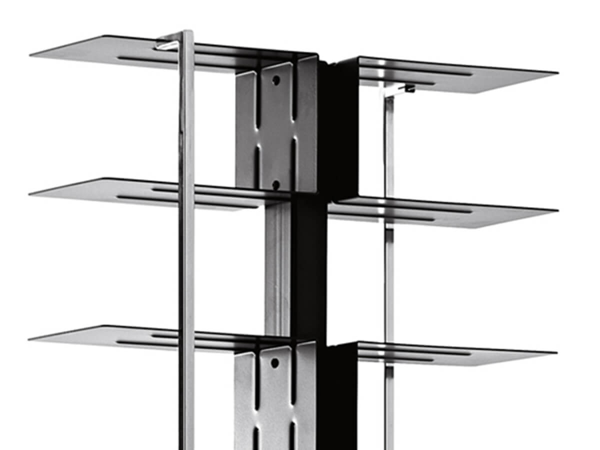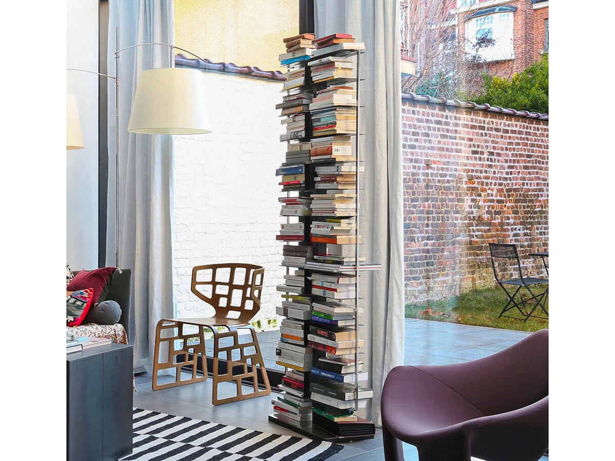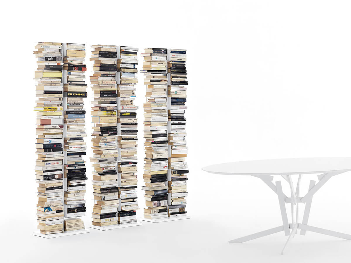 Un classico dell’arredo moderno. Ptolomeo è una libreria self standing dal design semplice e rigoroso, essenziale per lasciar posto all’ospite principale per cui è stata concepita: i libri. Ptolomeo elimina il superfluo connotandosi essenziale per un’unica colonna in acciaio a cui sono unite delle sottili mensole anch’esse in acciaio. Le mensole scompaiono man mano che la colonna si riempie di libri. Fin dalla sua nascita nel 2004 si è attestata come un’icona del design di settore, strutturandosi poi in diverse altezze fissate sulla solida base in acciaio inox o in metallo laccato coordinato con la struttura appositamente studiata per garantirne la stabilità.