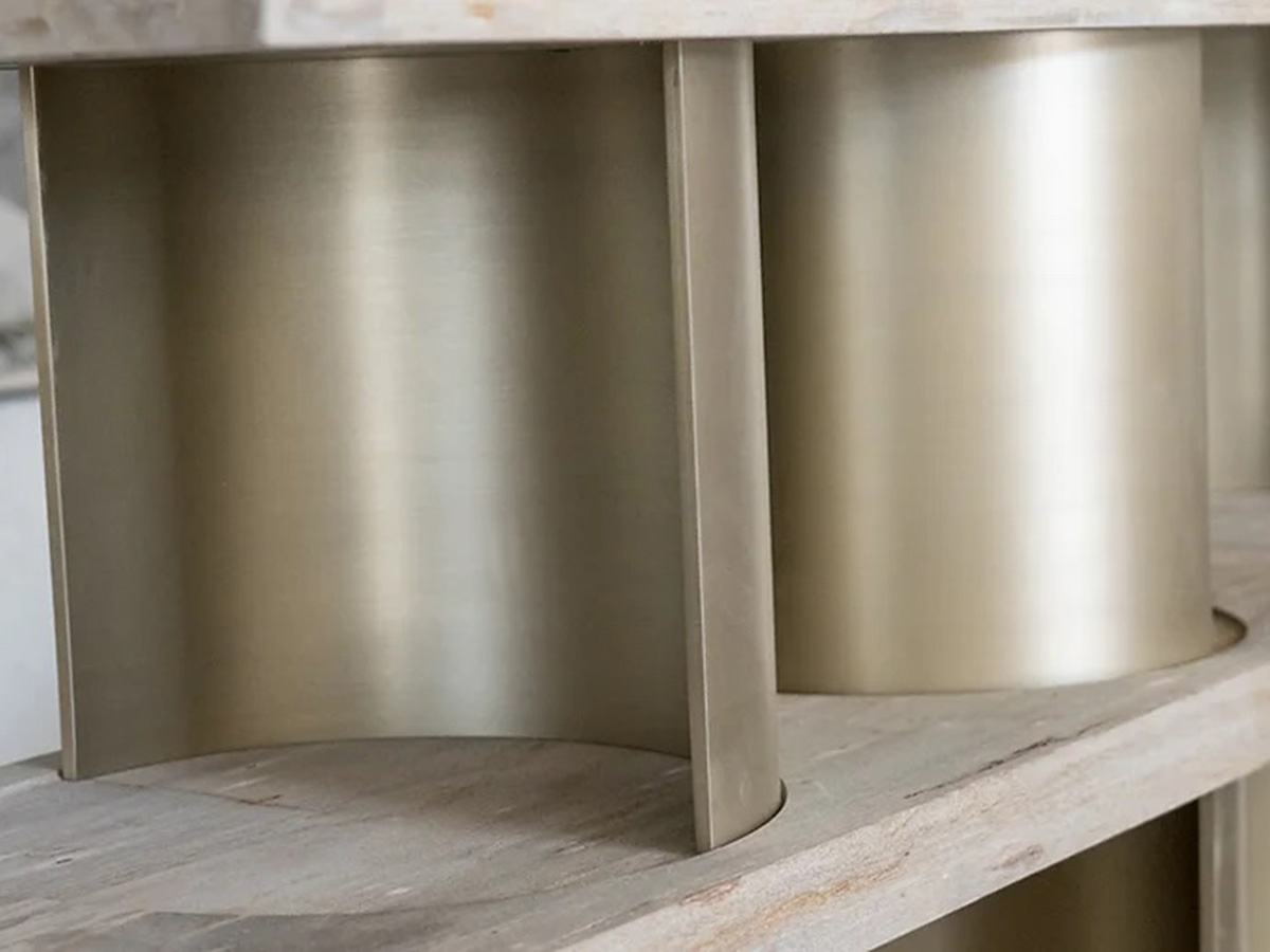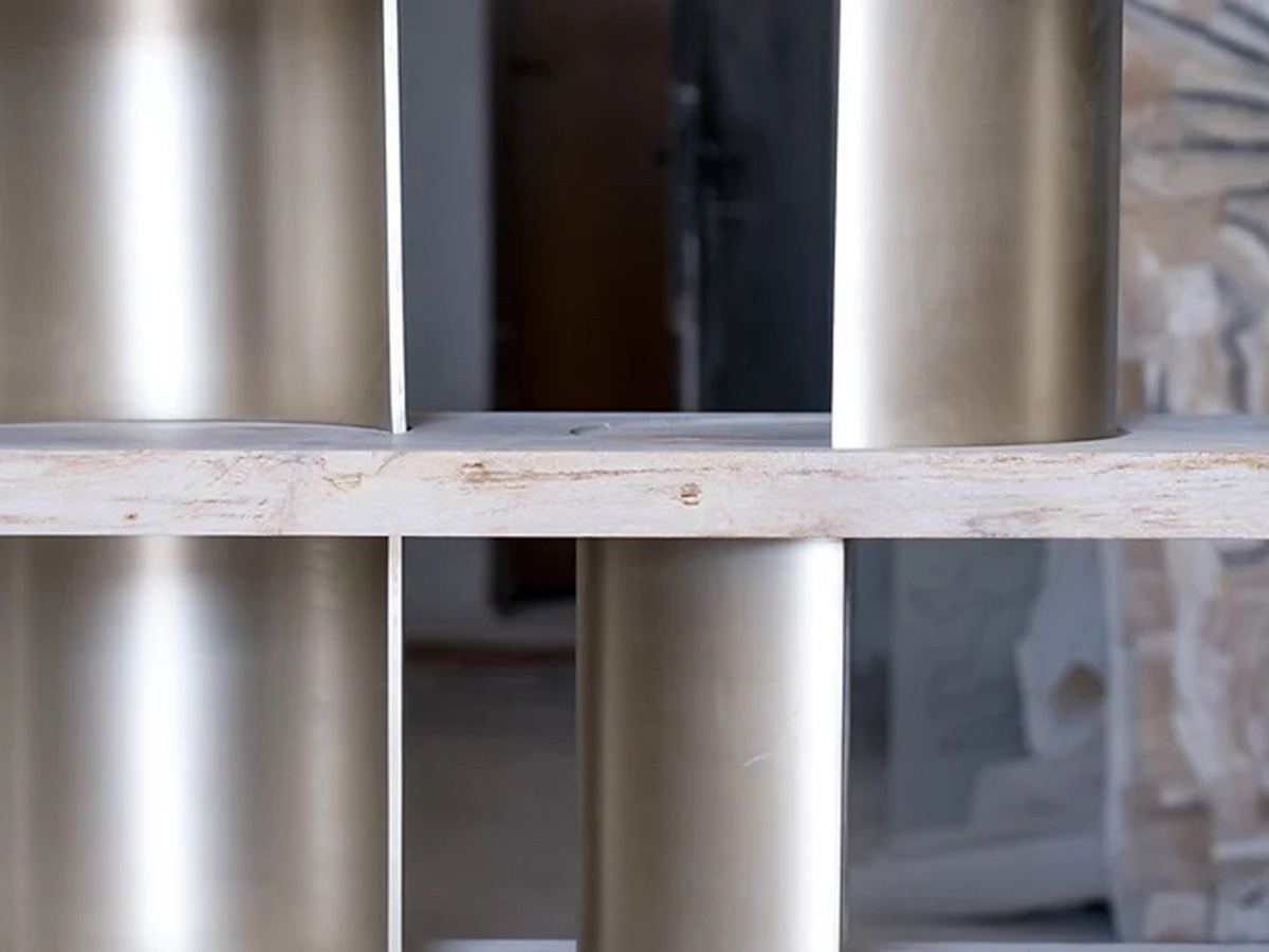 Un elemento d’arredo che unisce diversi elementi caratteristici e ha come protagonista il legno pietrificato, una rarità che qui si mostra sfoggiando la propria naturale bellezza. Il legno pietrificato nasce come conseguenza della fossilizzazione del legno e grazie a questo processo conserva dell’elemento originario le numerose venature e colorazioni che Pedretti Home ha voluto qui riportare senza apporre alcun tipo di modifica. La libreria Sfoia incamera la suggestione della pietra e vi unisce quella del metallo curvato, qui utilizzato per richiamare il libro, ovvero la parte dell’albero compresa tra la corteccia e il centro che porta la linfa alle foglie. La suggestione creata è unica e preziosa, ideale per chi desideri arredare con gusto offrendo all’occhio un oggetto carico di significato e meraviglia.