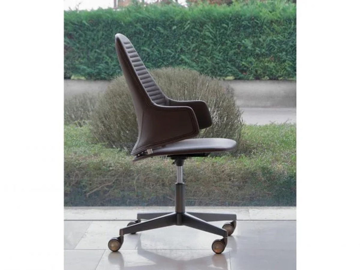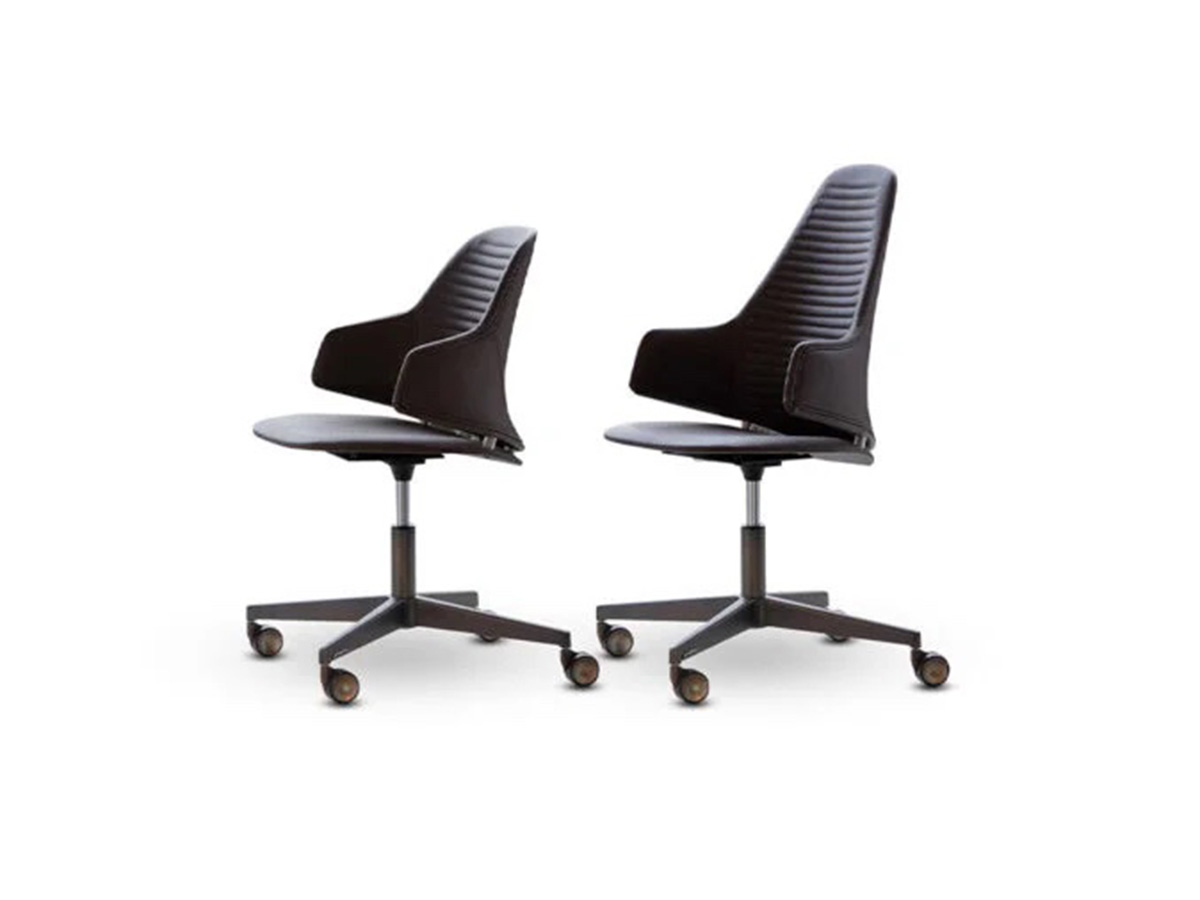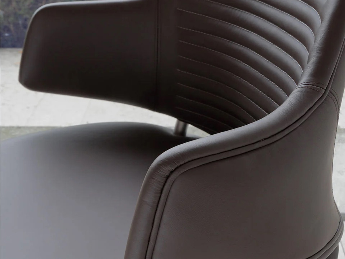 Una poltroncina unica nel suo genere, capace di presentarsi all’occhio come un solido intreccio di linee volte a creare un tutt’uno perfetto. Vela è una seduta con scocca in resina e legno e rivestimento in pelle o tessuto. Lo schienale, ampio e ben disegnato, è trapuntato per accogliere il corpo. Il basamento di Vela è in legno laccato lucido o in diverse finiture metalliche satinate, a seconda della situazione in cui si sceglierà di inserirla. Questa poltroncina si presta a numerosi utilizzi, soprattutto formali come uffici, sale d’attesa, reception o altro ancora, per via del suo taglio morbido e squadrato, nonché il prezioso intarsio di finiture che fra pelle, tessuto e metallo creano un universo tutto da scoprire.