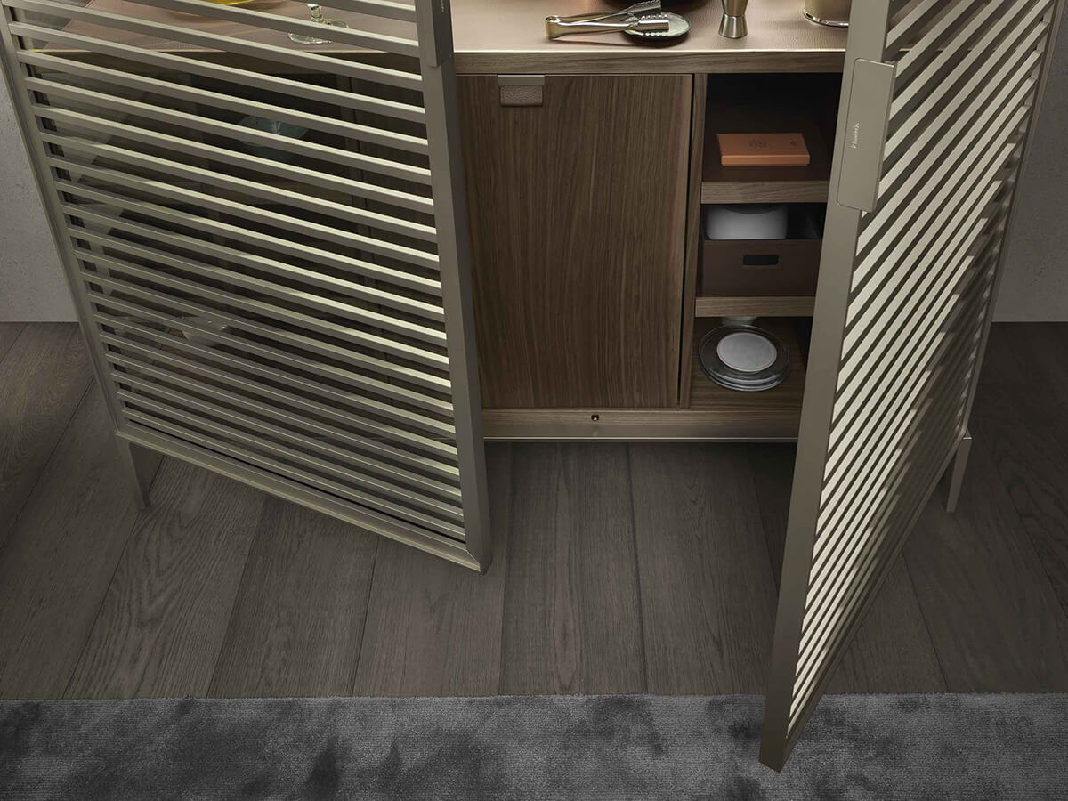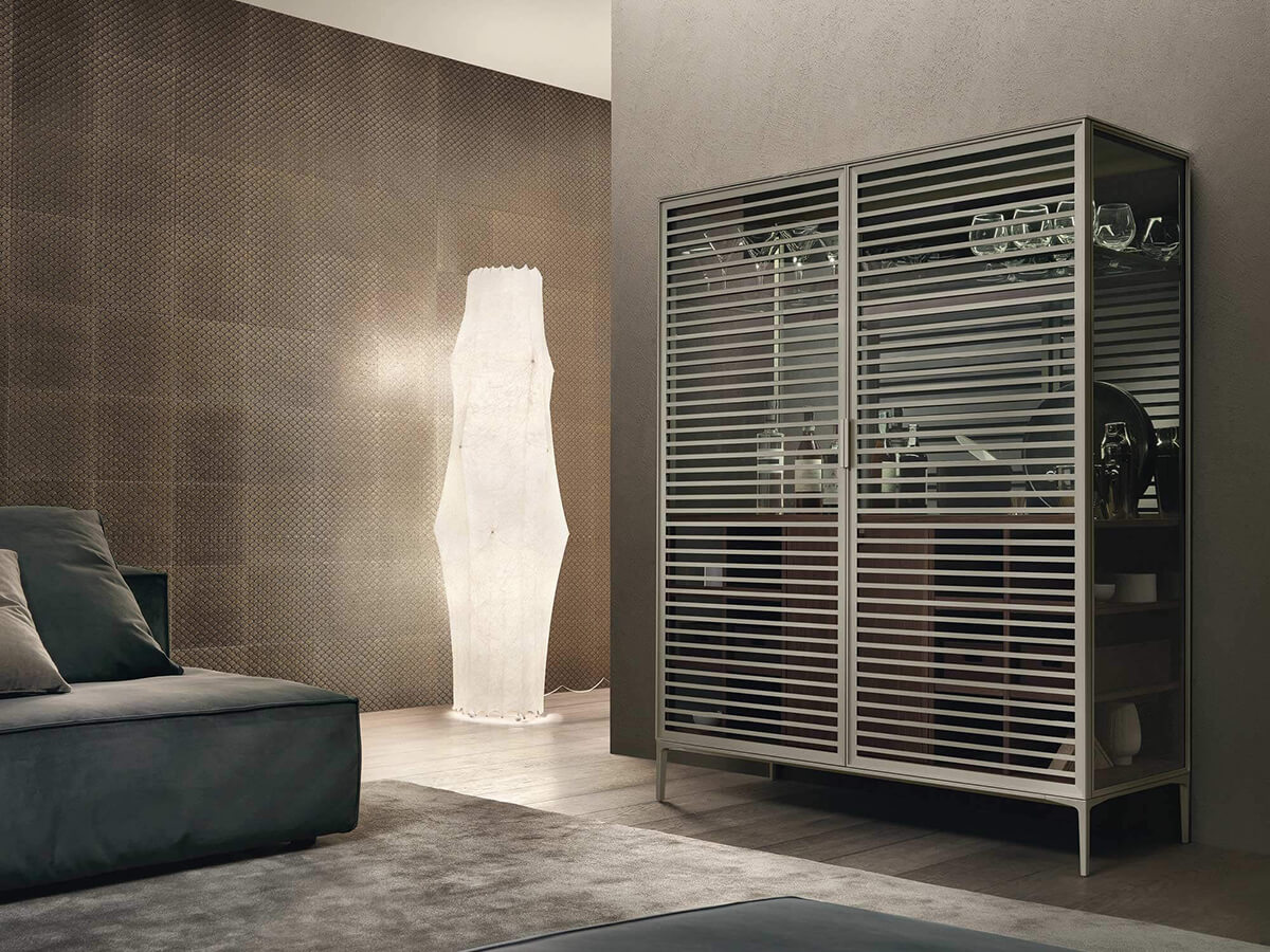 Il sistema Alambra di Rimadesio è una reinterpretazione in chiave modernissima del tradizionale concetto di madia e vetrina espositiva. La struttura in alluminio, sottilissima e poco invadente, lascia tutta l’attenzione alla finitura delle ante: queste possono essere in vetro trasparente, in mood da valorizzare il contenuto della madia, oppure in vetro verniciato nei numerosi colori della gamma Ecolorsystem Rimadesio. In un’altra versione l’anta è parzialmente coperta da una fitta successione di traversini paralleli che occultano in parte la vista dell’interno in un effetto in un “effetto vedo-non vedo” di grande raffinatezza. Particolare attenzione è stata dedicata da Rimadesio nell’ingegnerizzazione del sistema di apertura e chiusura, pratico e silenzioso, totalmente privo di viti e guarnizioni.*Caratteristiche tecniche: disponibili anche con illuminazione Led