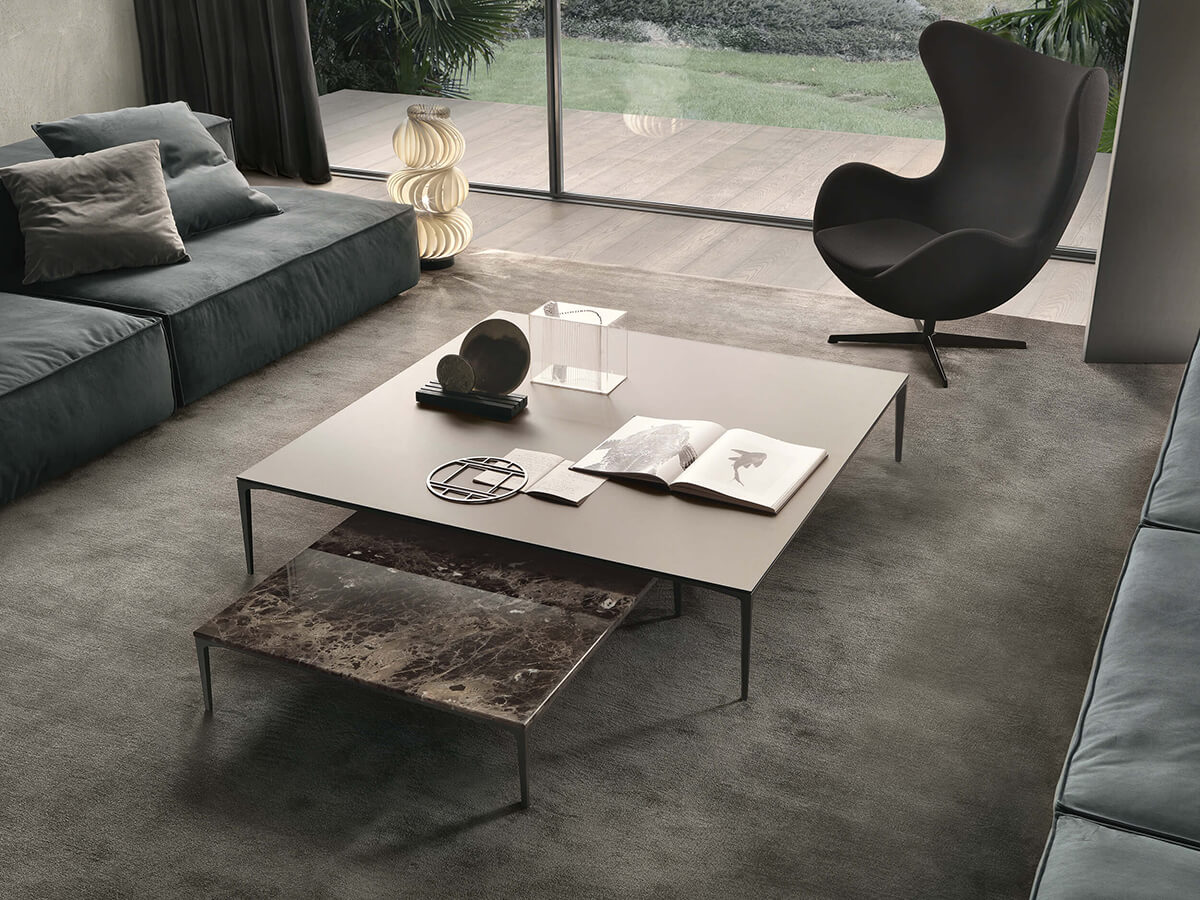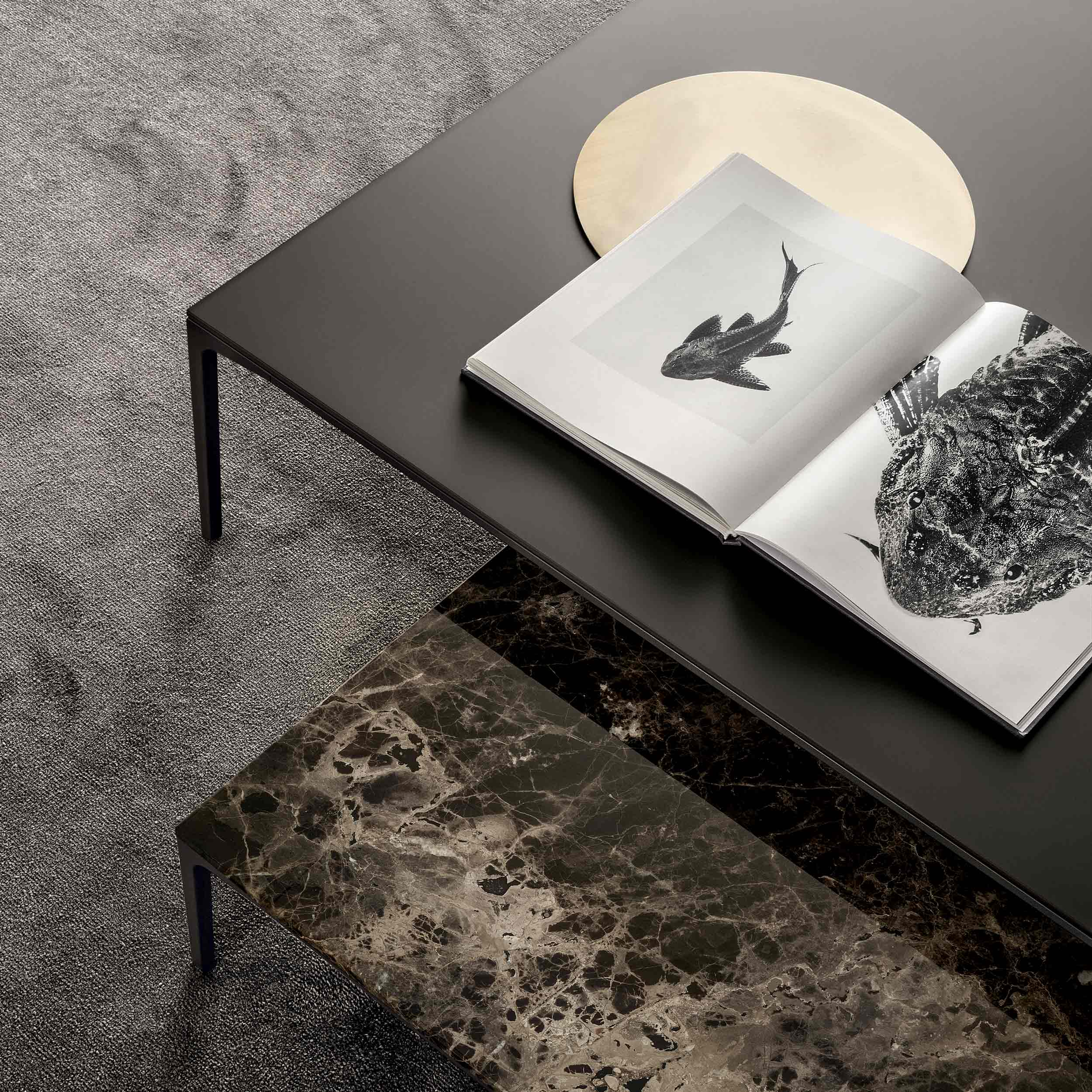 Il tavolino Tray è un mix di minimalismo e lusso in pieno stile Rimadesio. Le sue forme sono essenziali, quasi archetipiche: quattro corte e sottili gambe in alluminio ai lati sorreggono un piano squadrato e rigoroso, in cui l’effetto complessivo è addolcito da una leggera stonatura degli angoli. Tray è disponibile in due altezze che permettono la creazione di composizioni di tavolini con sovrapposizioni e intersezioni fra i piani, a loro volta disponibili in vetro laccato, marmo o essenza in una gran varietà di effetti. Tray è un classico coffee table, perfetto per essere posizionato al centro del salotto, ma la sua rigorosa semplicità lo rende adatto anche come complemento di arredo in molti ambienti differenti.