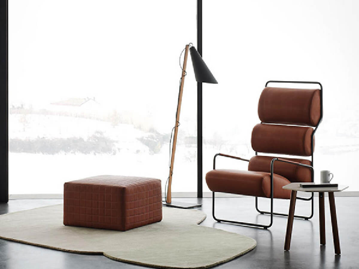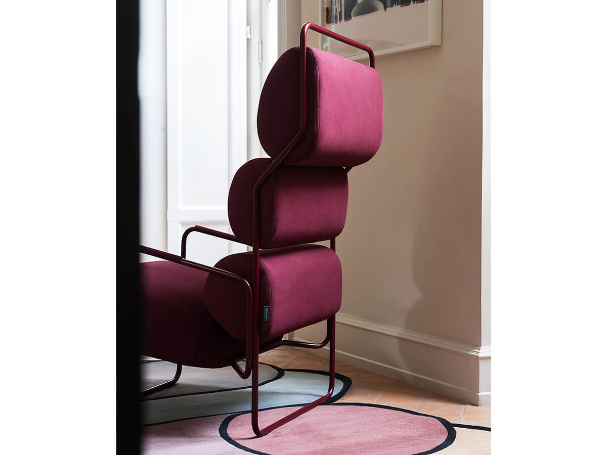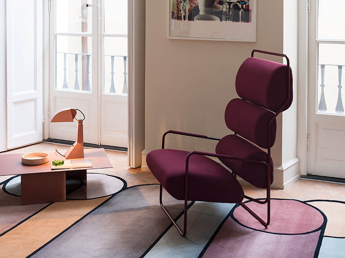 Dai tratti fortemente sperimentali, la poltrona Sancarlo di Achille Castiglioni riedita da Tacchini presenta una seduta e uno schienale scomposti in quattro diversi cuscini dalla comoda e ampia imbottitura che contrastano con la sottile linea della struttura metallica a cui sono fissati, la quale è composta da due lunghe cornici curvate che corrono lungo tutto il perimetro della poltrona andando a comporre anche gambe e braccioli. Disegnata originariamente per Driade nel 1982, Sancarlo è per Castiglioni anche una forma di ironica auto-citazione: riprende infatti in parte la silhouette della sua storica poltrona Sanluca (oggi riproposta da Poltrona Frau), di cui costituisce di fatto una avanguardistica versione scarnificata e ridotta agli elementi essenziali.