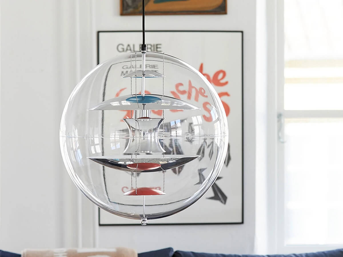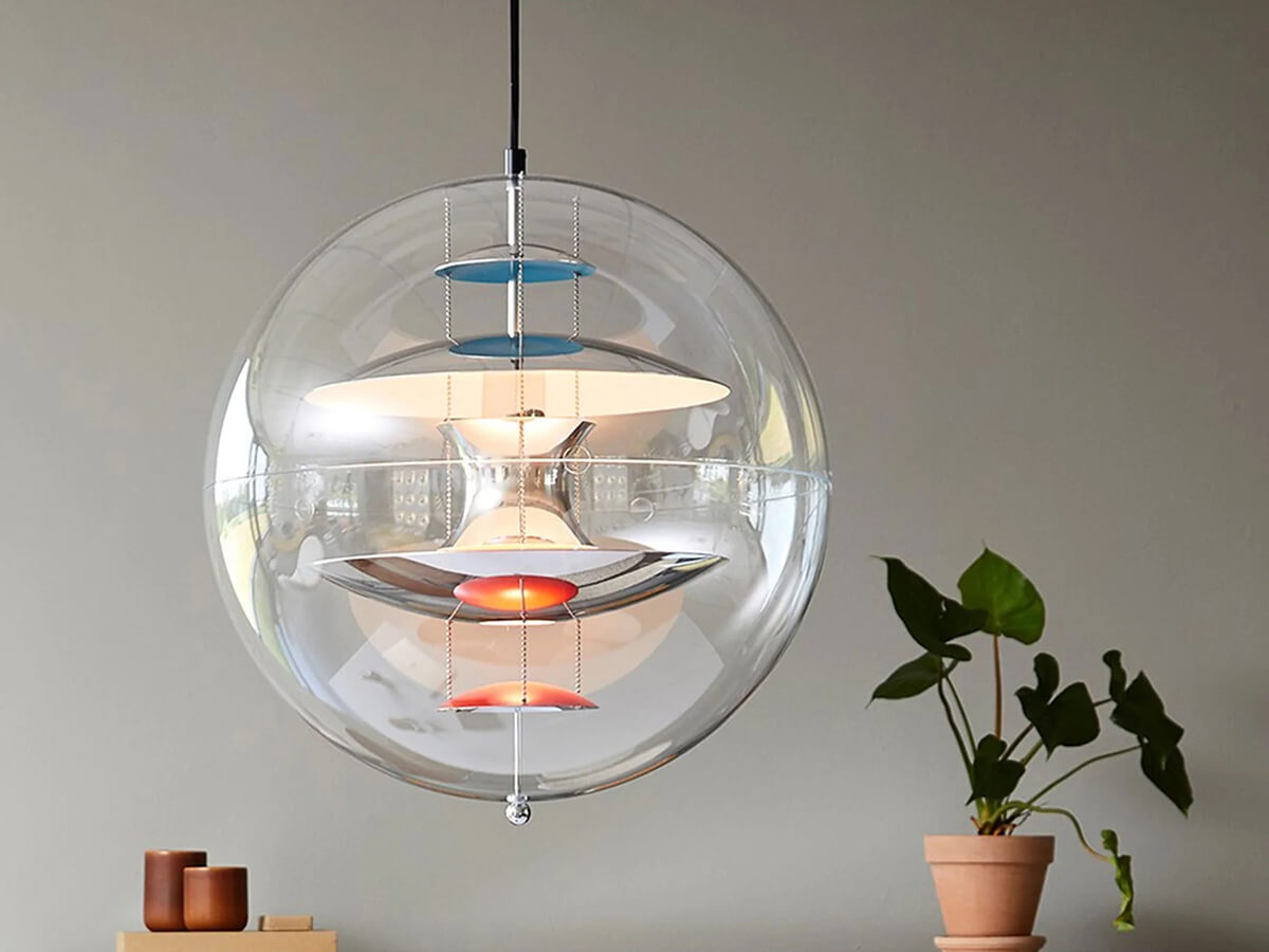 Icona dello stile Space Age, la lampada a sospensione VP Globe di Verpan è una delle creazioni più famose di Verner Panton. VP Globe, disegnata nel 1969, pare uscita da un film di fantascienza dell’epoca: è costituita da una sfera in acrilico trasparente che racchiude una serie di dischi e riflettori concavi in alluminio brillante, ingentiliti da alcuni tocchi di rosso e di blu e tenuti sospesi da tre piccole catenelle. Simmetrica, equilibrata e dal forte impatto scenografico, VP Globe fece il suo debutto nella mostra Visiona 2 allestita da Panton presso la Fiera di Colonia e può essere utilizzata in tanti ambienti differenti, sia da sola che accostandone diversi esemplari.