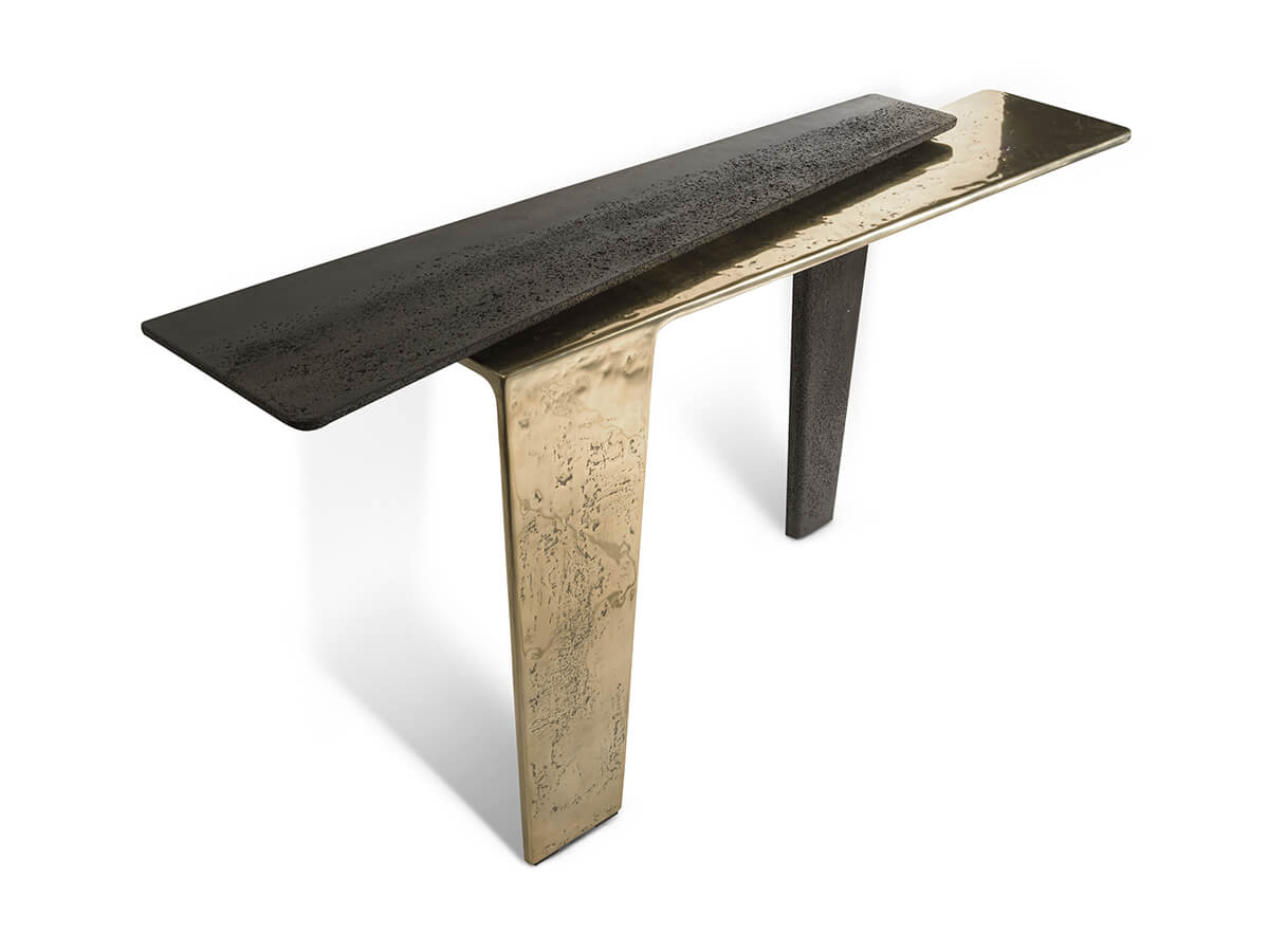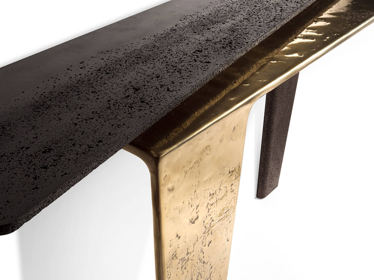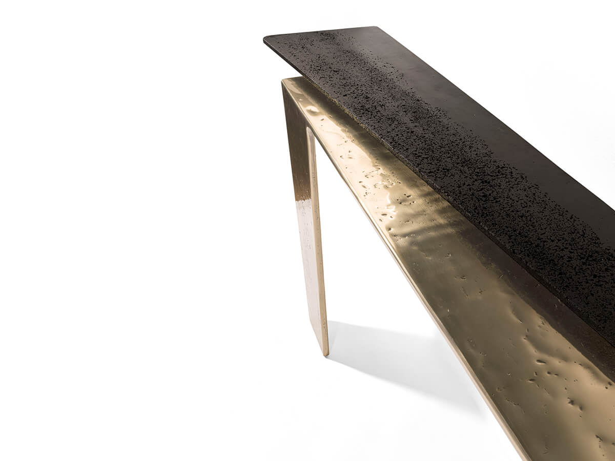 Un oggetto dal fascino radicale, supremo quasi quanto l’assoluta semplicità delle forme, studiate per unirsi senza sbavo. La struttura di Lego è in cemento e alluminio. La parte in cemento armato è lavorata con trattamento di erosione e colorazione nero opaco. Le parti in alluminio sono invece realizzate per fusione in sabbia con testure ondulata, lucidata e pigmentata a mano. Gli elementi possono essere assemblati in diverse configurazioni. Interessante fusione di materiali forti e solidi, Lego è una consolle che ben si presta a utilizzi eterogenei. Caratteristiche tecniche: consolle regolabile in tre diverse dimensioni; struttura in alluminio e piano in cemento nero