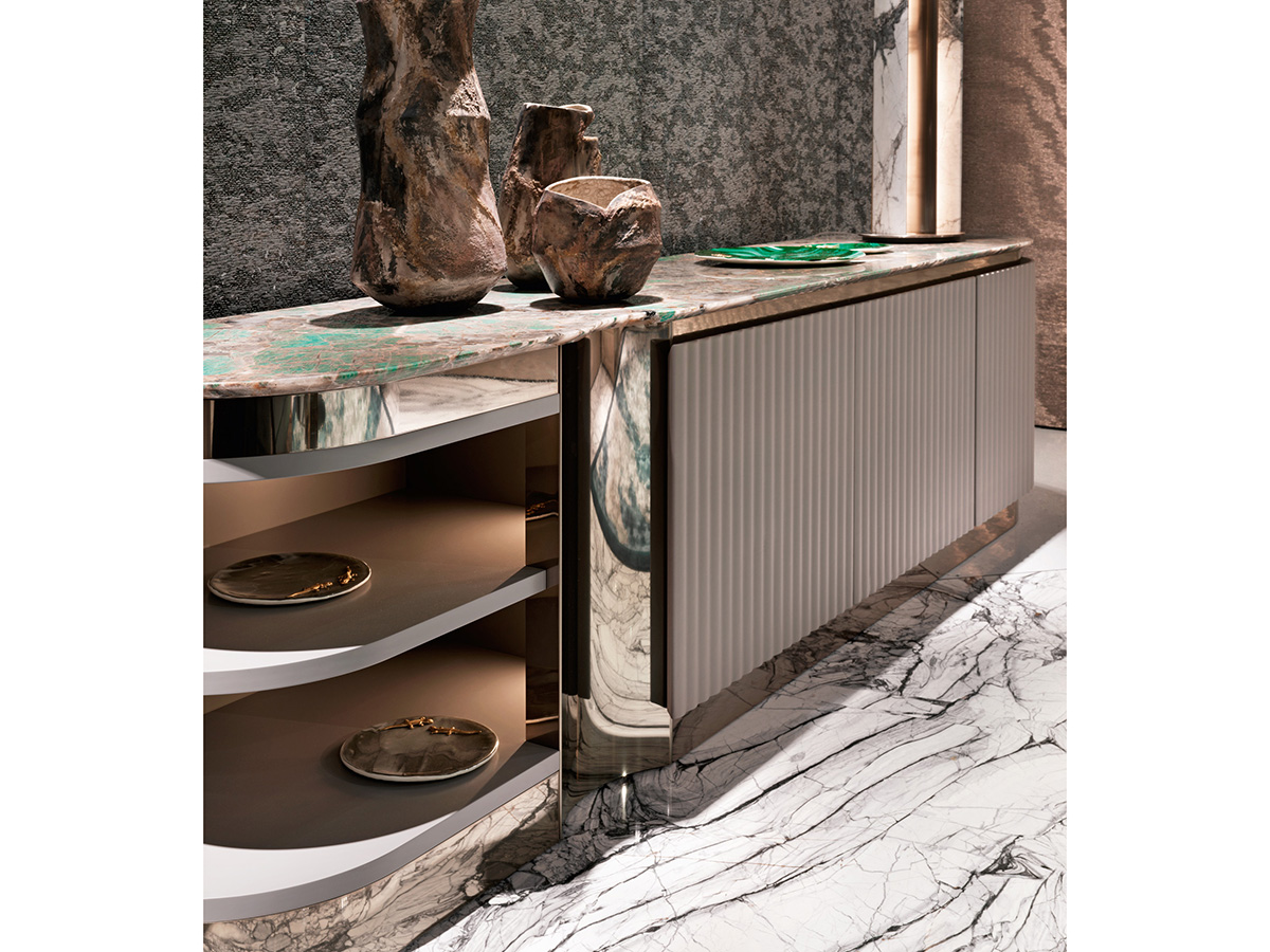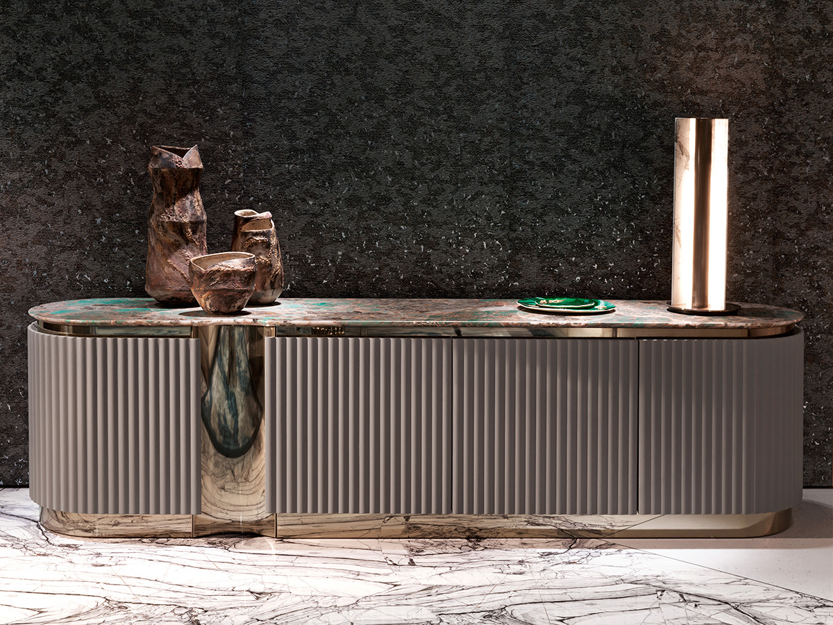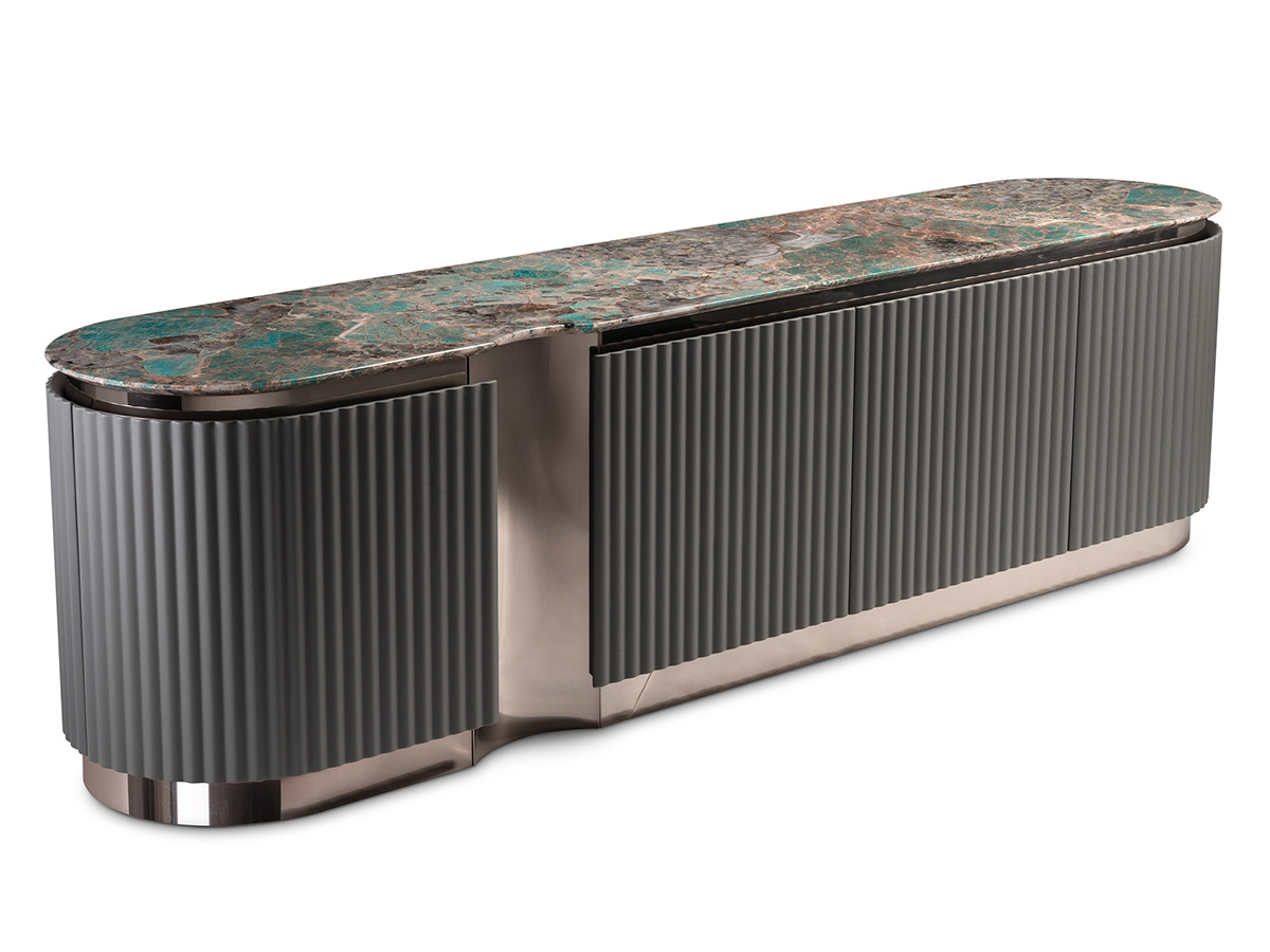 Solida e statuaria, Leonardo è una madia in legno e acciaio contraddistinta da una forma pura dove un ovale regolare viene impreziosito dal contrasto di volumi concavi e convessi del legno sagomato. Interessante è il gioco delle ante dove una lavorazione 3d a cannettata può essere rivestita in pelle o tessuto per creare un effetto non solo bello ma anche gradevole al fatto. Il top è in marmo e lavorato sui bordi per enfatizzare la pulizia delle linee e dell’intera struttura. Un bracciale metallico avvolge la struttura portante con un coperchio scrigno realizzato in amazzonite.