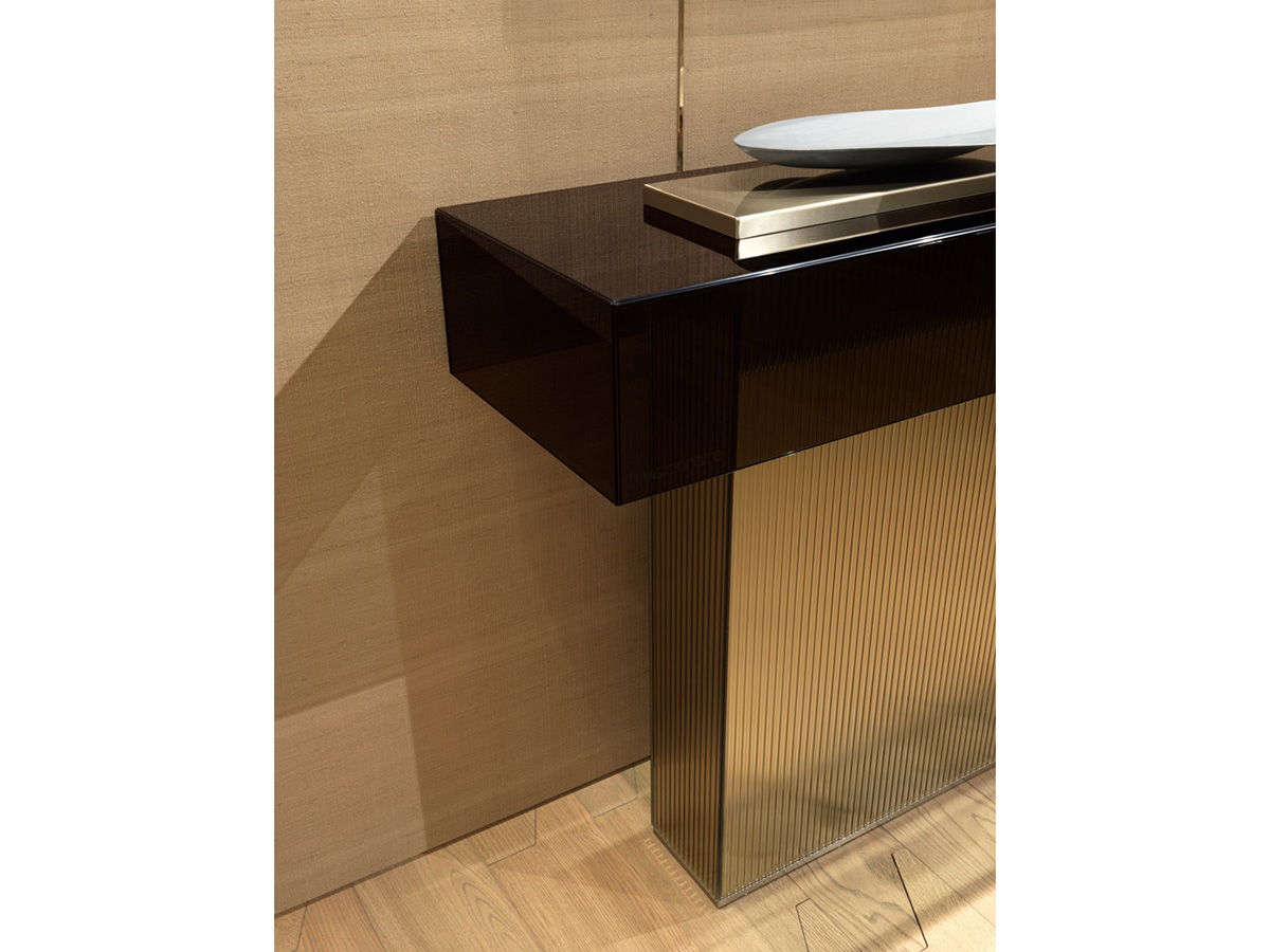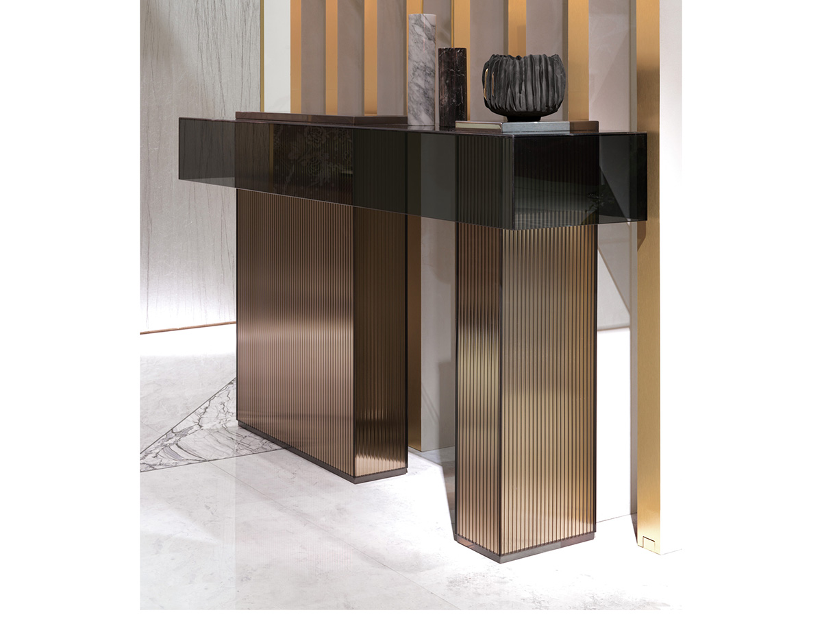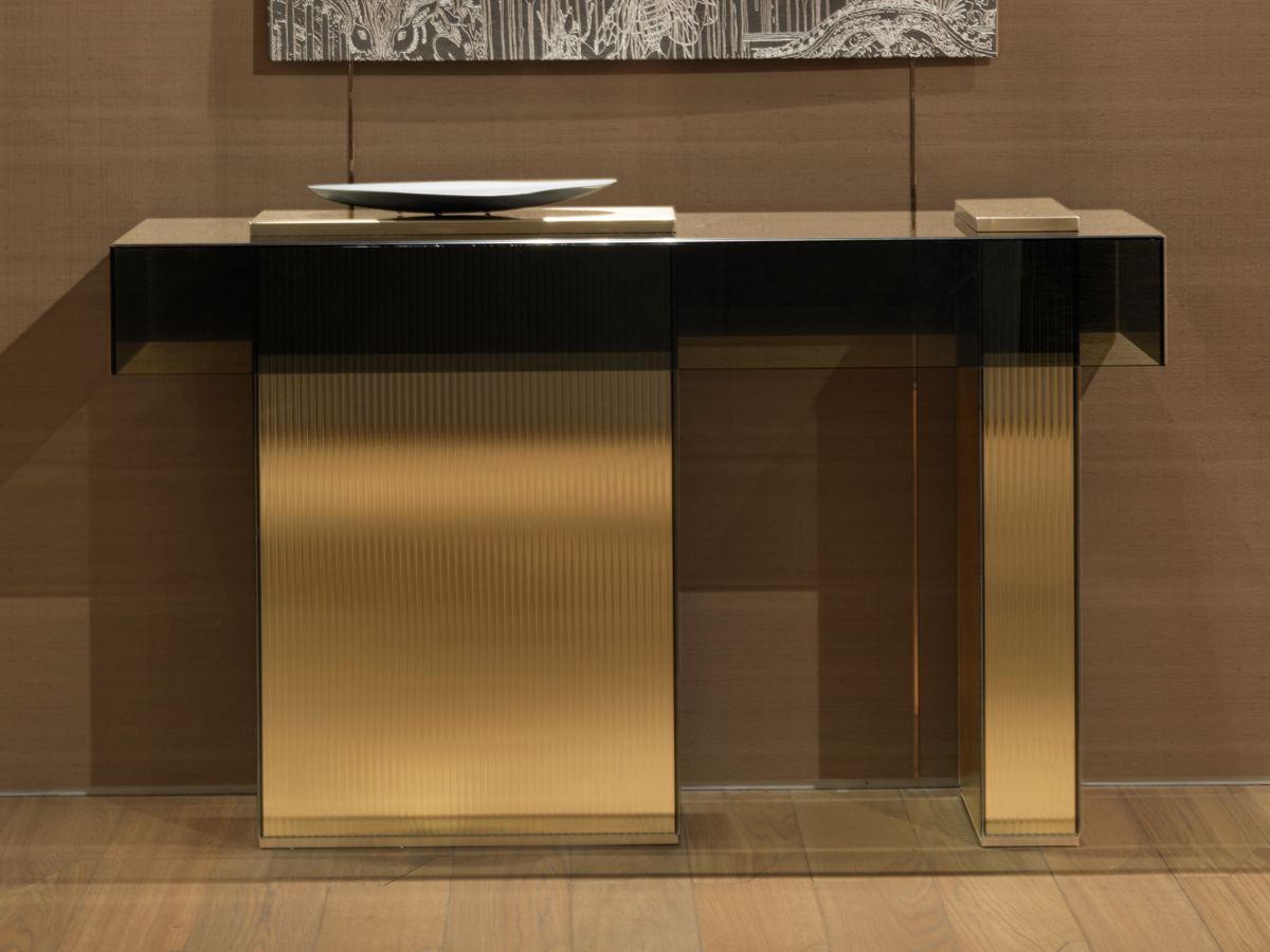 Un arredo a cavallo fra nuovo e antico, fra aspettato e inaspettato. Marty è una consolle in vetro composta da due basamenti rivestiti in specchio bronzo con superficie canalettata in rilievo. Il top è in cristallo fumé scatolato tramite saldatura UV. La sua configurazione è stata voluta da Marco Piva e formulata per meglio identificare un oggetto lussuoso che tuttavia non manca di rispecchiare una ricerca formale approfondita, volutamente asimmetrica e difficilmente connotabile.