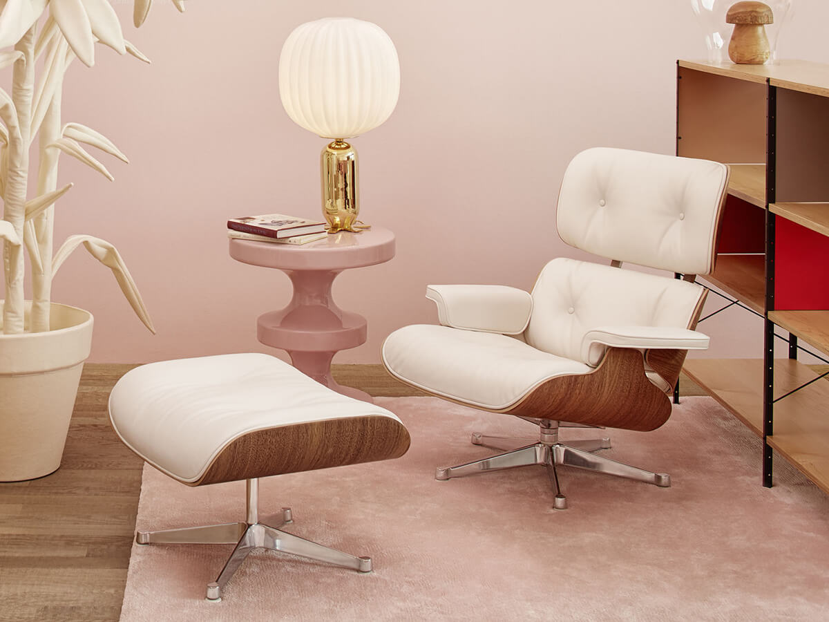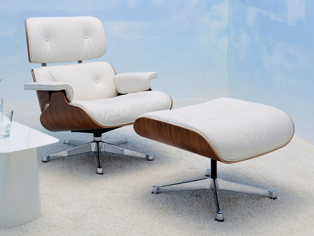 *Prezzo valido per la versione Eames Poltrona & Pouf con scocca in noce pigmentato bianco – base lucida – rivestimento in tessuto cat. F100 (cod. 412 116 00).