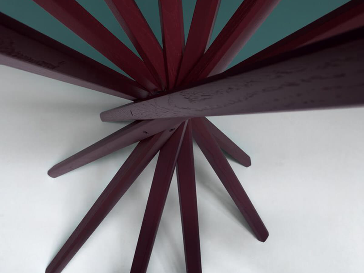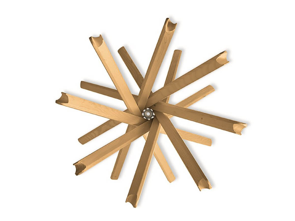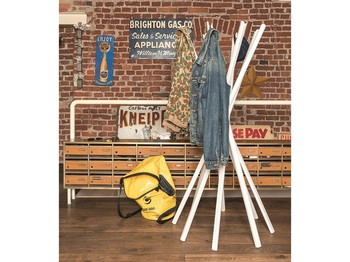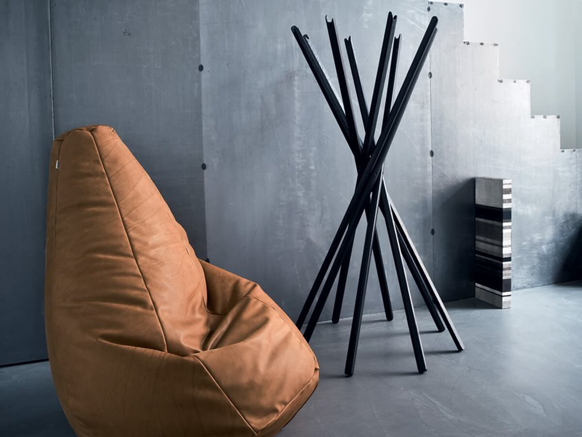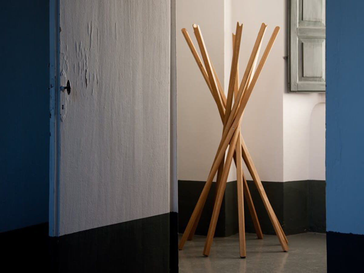 L’appendiabiti Sciangai di Zanotta è stato premiato con il Compasso d’Oro nel 1979 ed è una delle creazioni più celebri del trio di designer De Pas – D’Urbino – Lomazzi. Deve il suo nome a un famoso gioco da tavolo cinese effettuato con dei sottili bastoncini, lo Shangai (detto anche Mikado), nel quale durante le fasi di preparazione della partita gli stecchi vengono riuniti in un unico fascio e poi lasciati cadere a ventaglio. Lo stesso principio viene ripreso dai listelli che compongono l’appendiabiti: inizialmente uniti, quando Sciangai viene aperto vanno a separarsi fino a quando un perno centrale li ferma nella posizione ritratta in foto. La parte terminale di ogni listello è sagomata a gola, rendendo così più agevole la presa su cappotti e abiti.