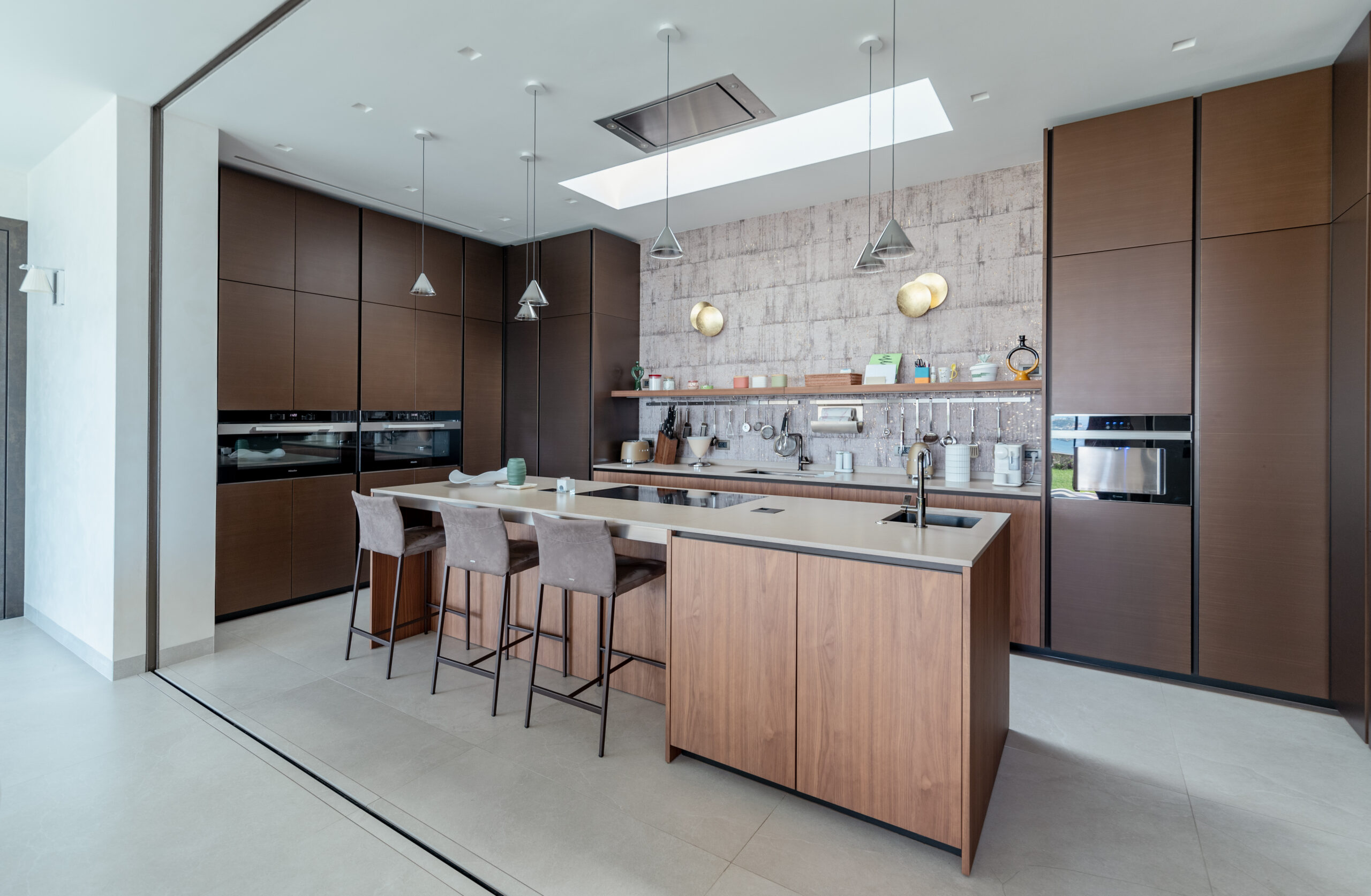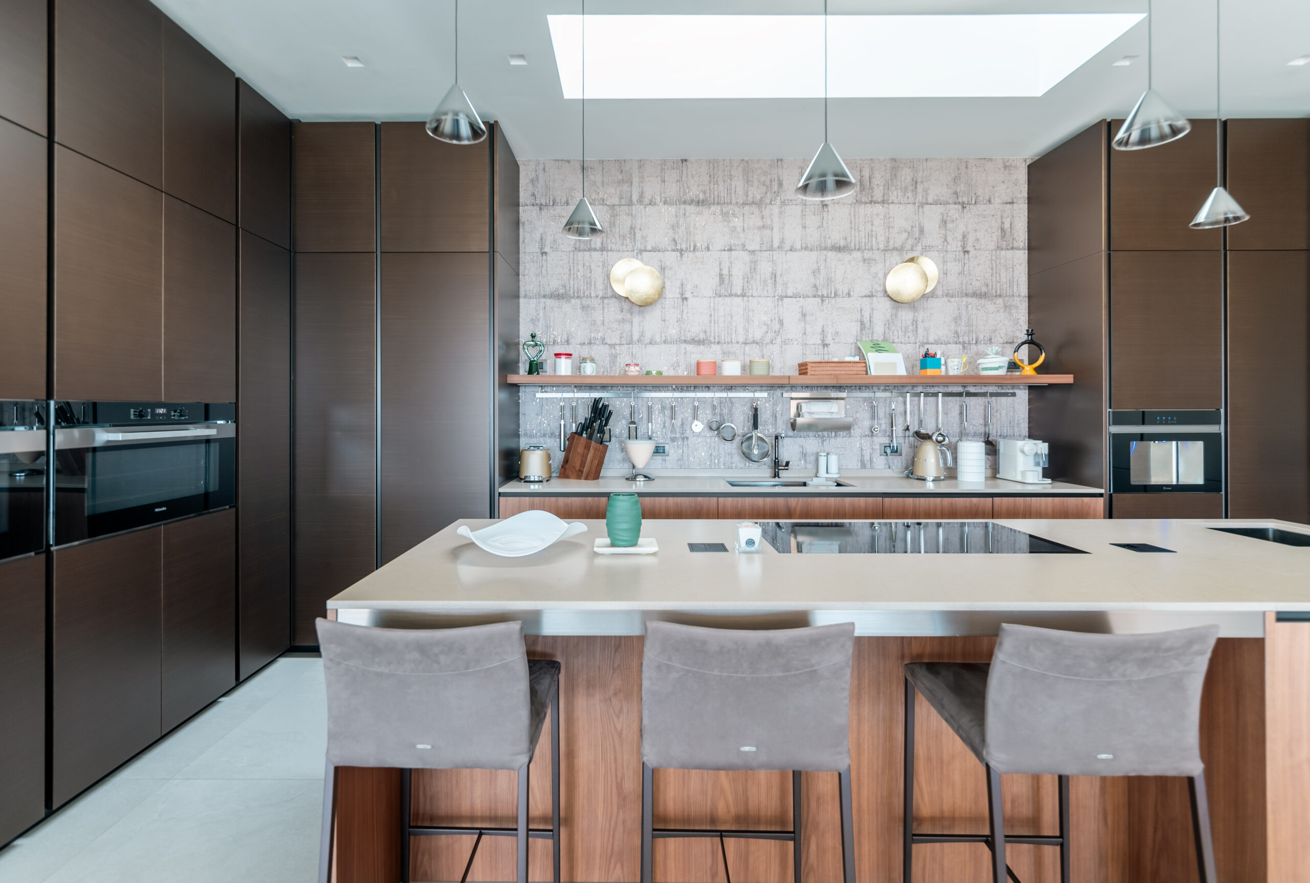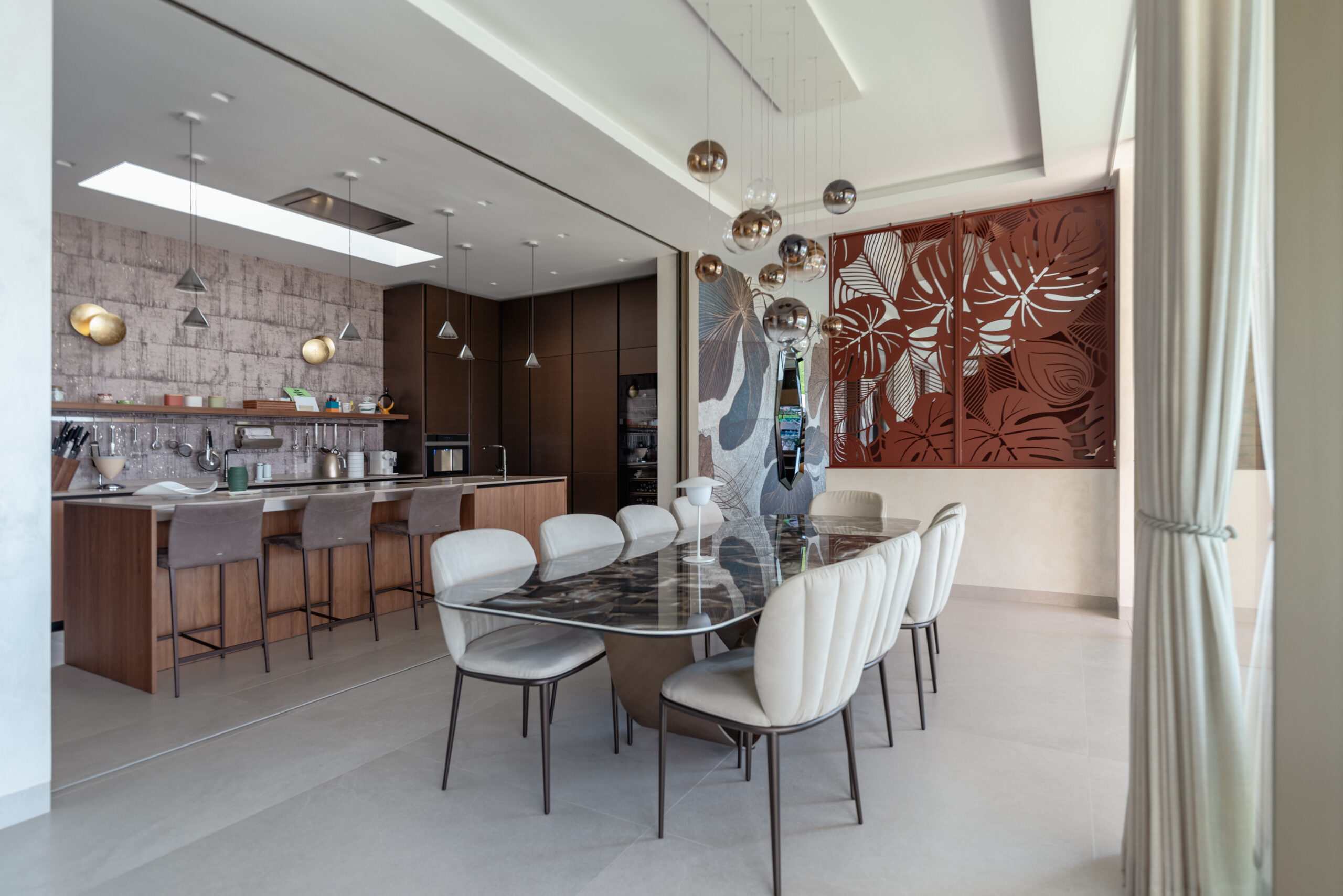 La scelta di tonalità brunite ritorna nella cucina Poliform e nel tavolo Cattelan Italia dove l’utilizzo del legno è affiancato da un sapiente uso di metalli in varie tonalità. La generosa illuminazione offerta dalle vetrate a parete viene ulteriormente esaltata dalle lampade a parete Catellani&Smith e dall’imponente lampada a sospensione collocata sopra al tavolo da pranzo.