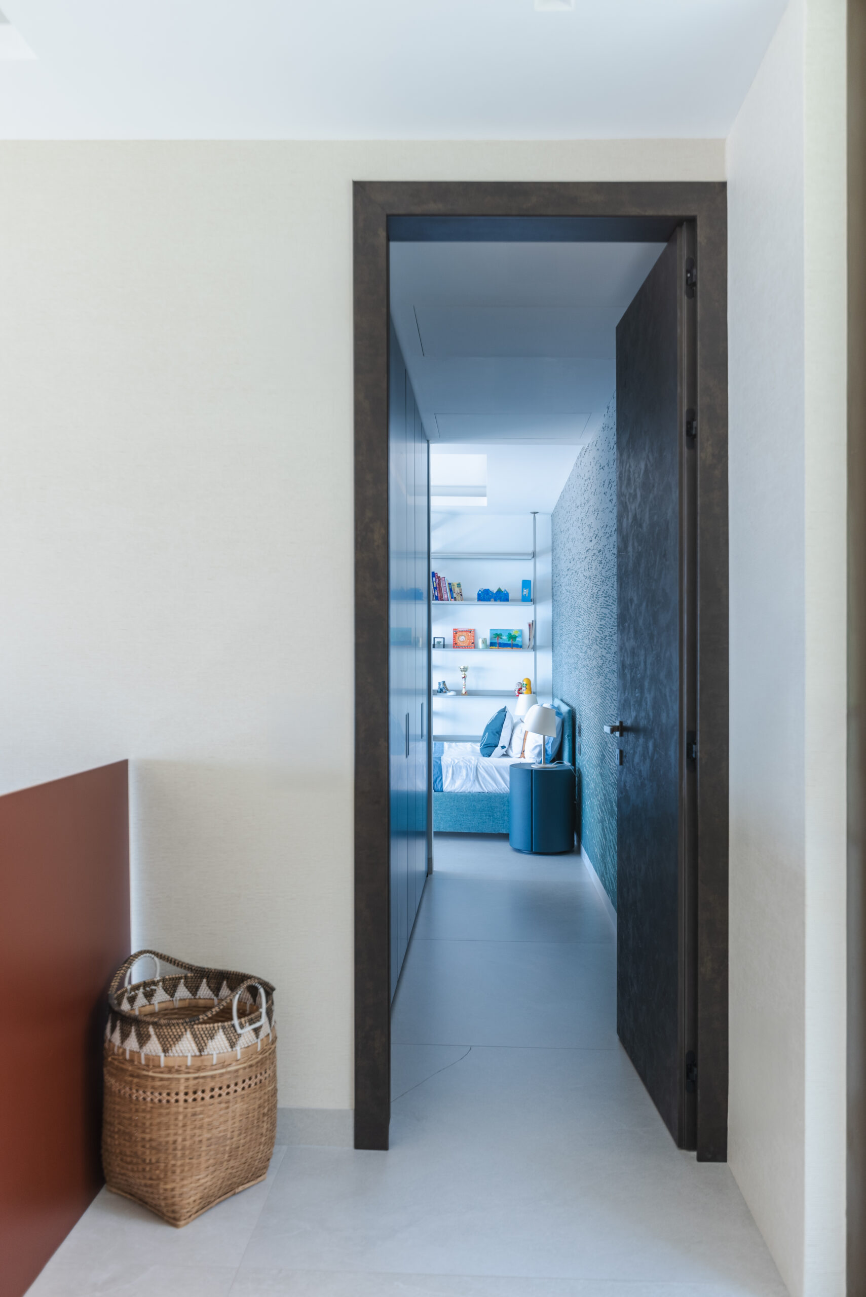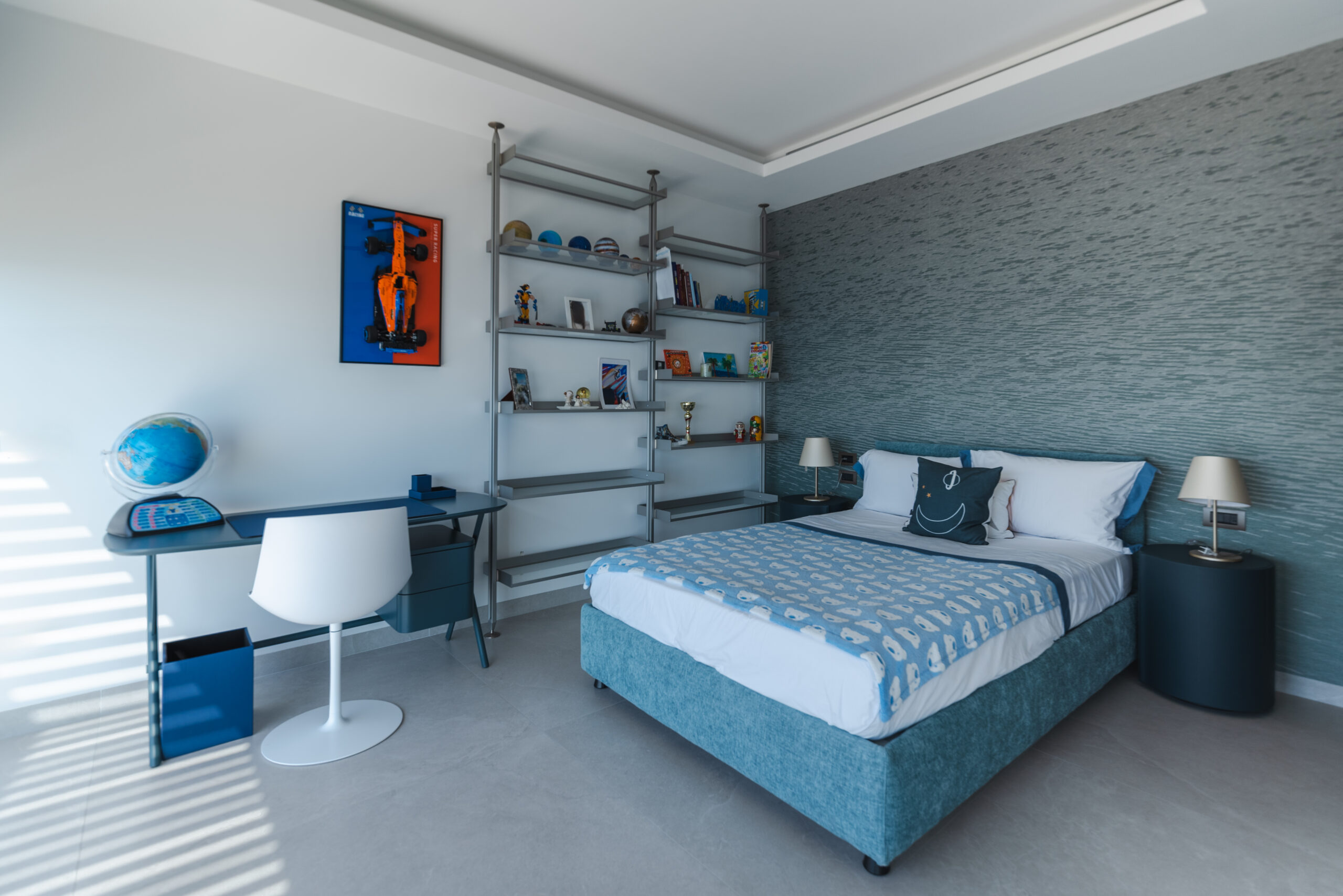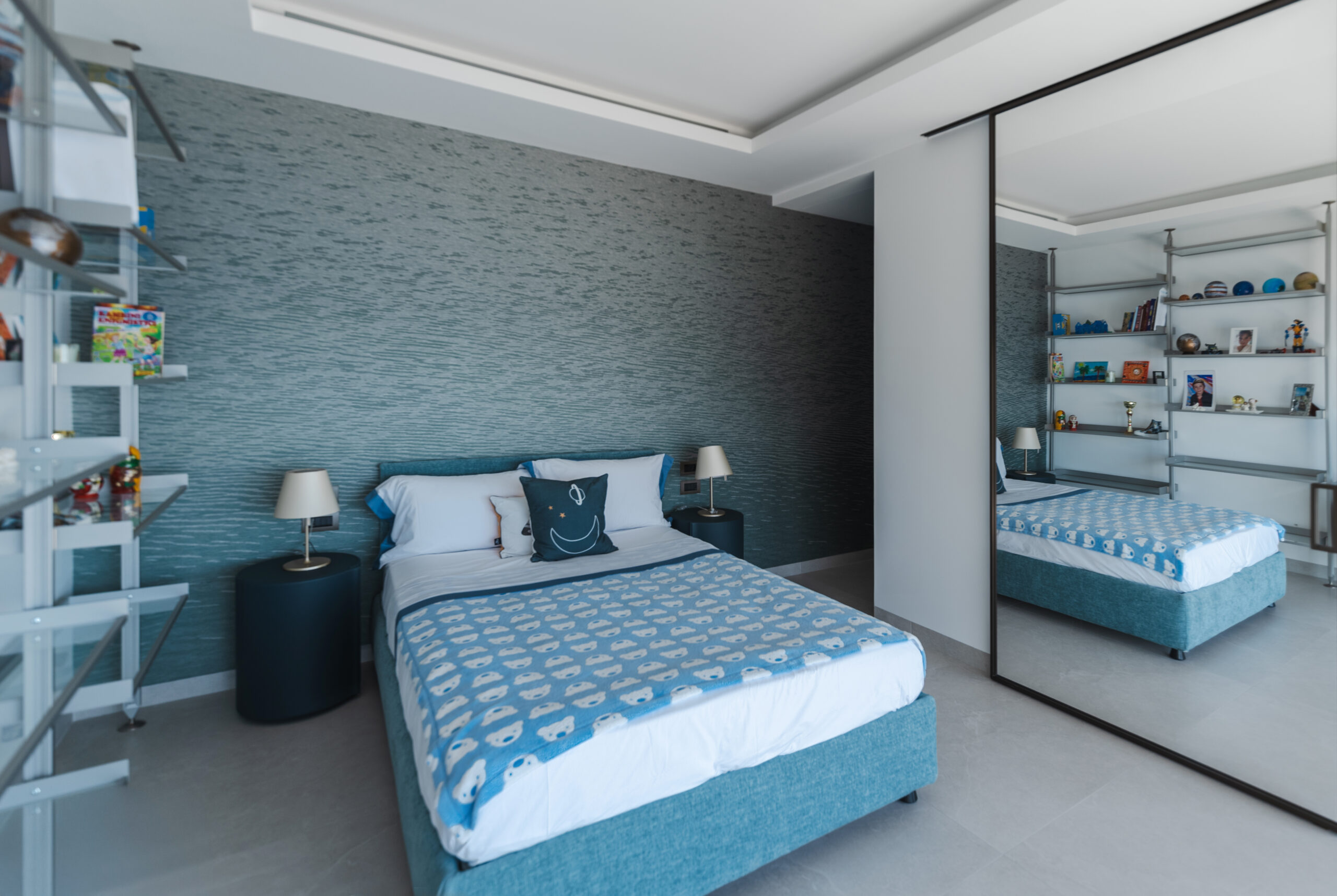Il piano superiore è riservato alle camere da letto e ai bagni, studiati per esprimere una perfetta sintesi di gusto e personalità di ogni componente della famiglia. Colori e stile si coordinando l’un l’altro creando per ogni ambiente un peculiare tocco distintivo: sofisticato nella camera padronale, giocoso e fresco nella cameretta, sobrio nel piccolo studio/camera accessoria.