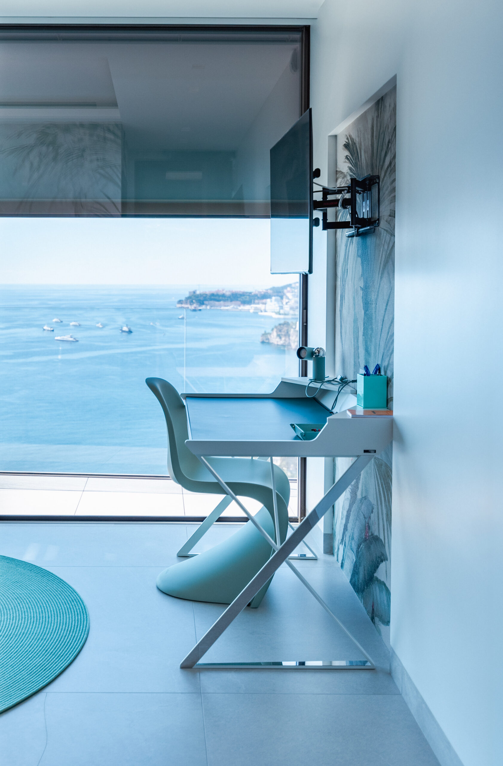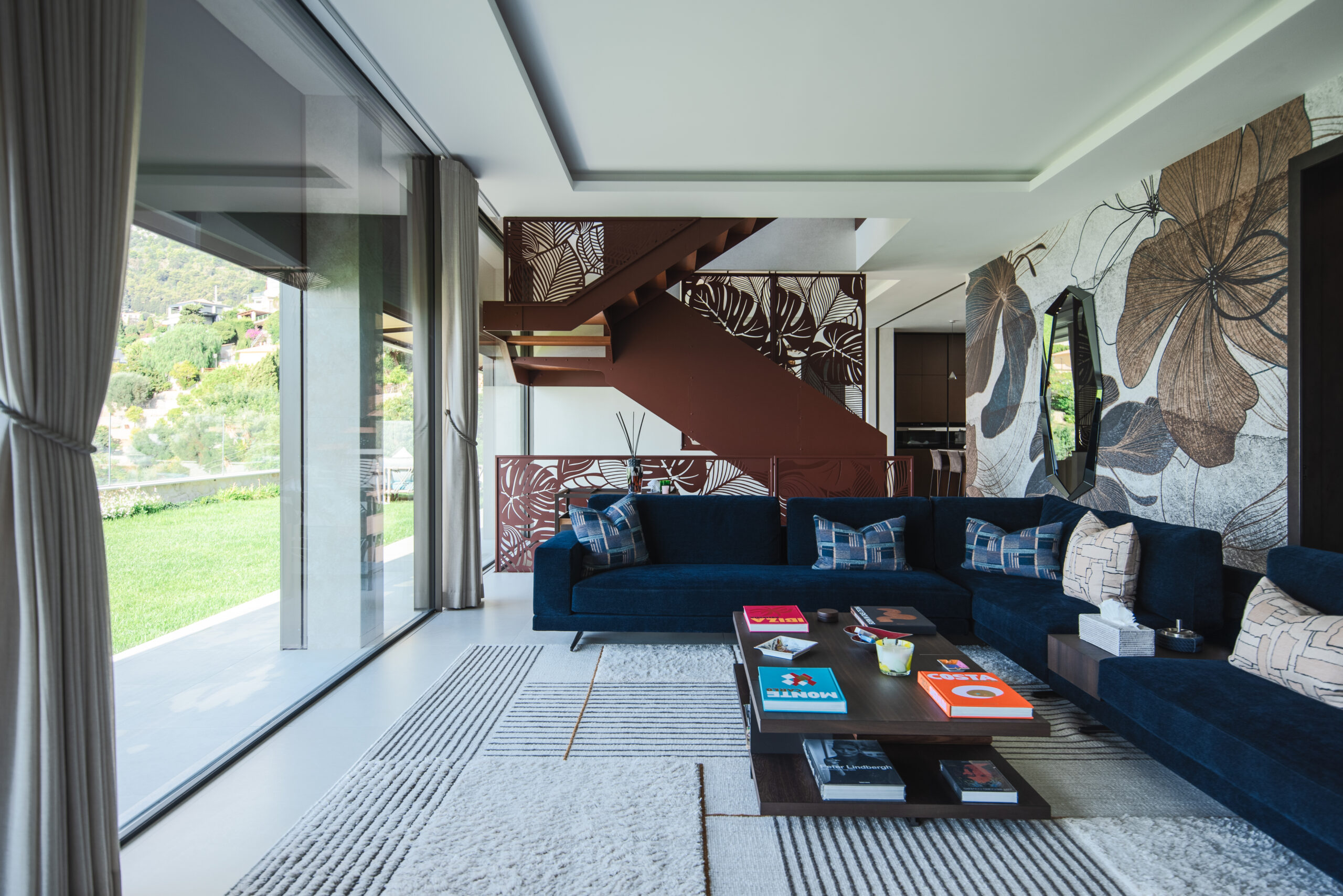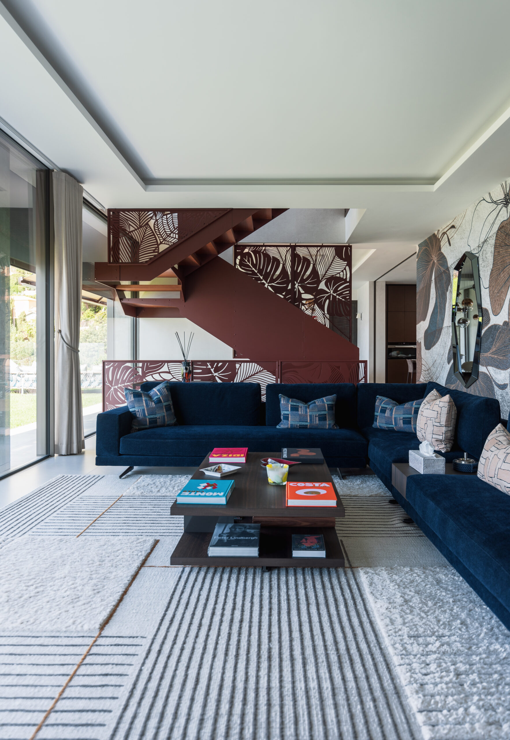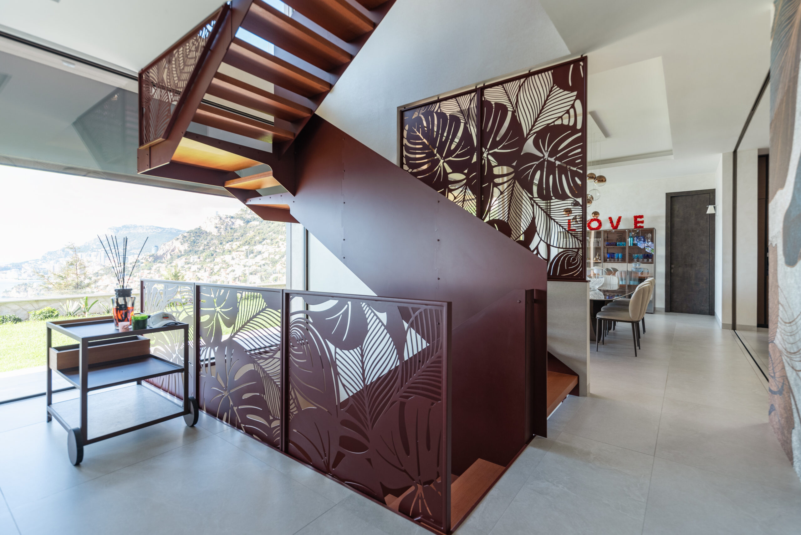 La planimetria interna segue la naturale conformazione dell’altipiano di Roquebrune Cap Martin, prediligendo uno sviluppo orizzontale e verticale che vede al piano “terra” un’ampia zona living correlata da uno spazio cucina e dining. L’arioso open-space di questi ambienti è inframmezzato da librerie in legno e da una imponente scala con pannelli in metallo traforati. I motivi vegetali di questo elemento vengono ripresi dalla carta da parati WallPepper in un armonioso duo di forma e colore.