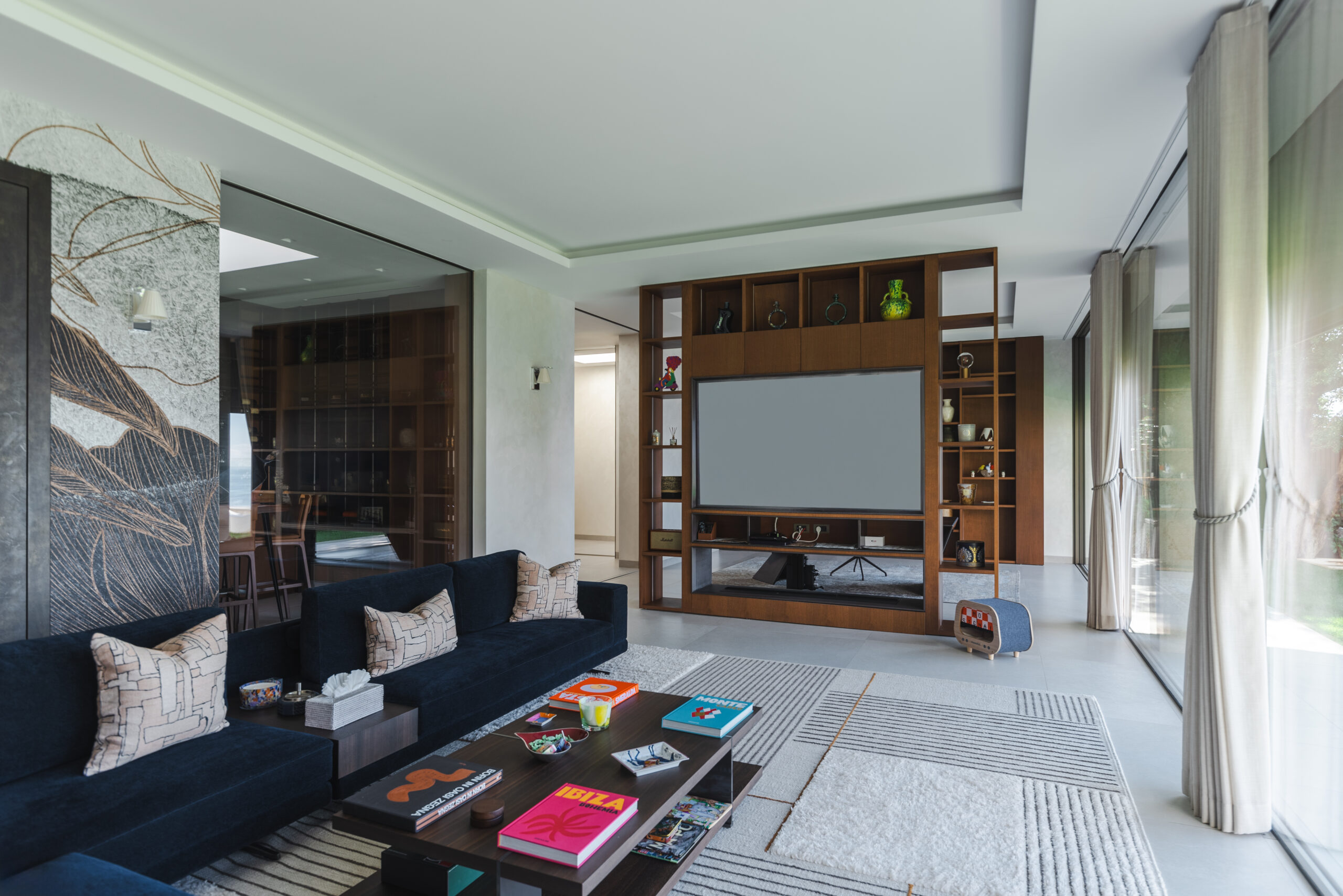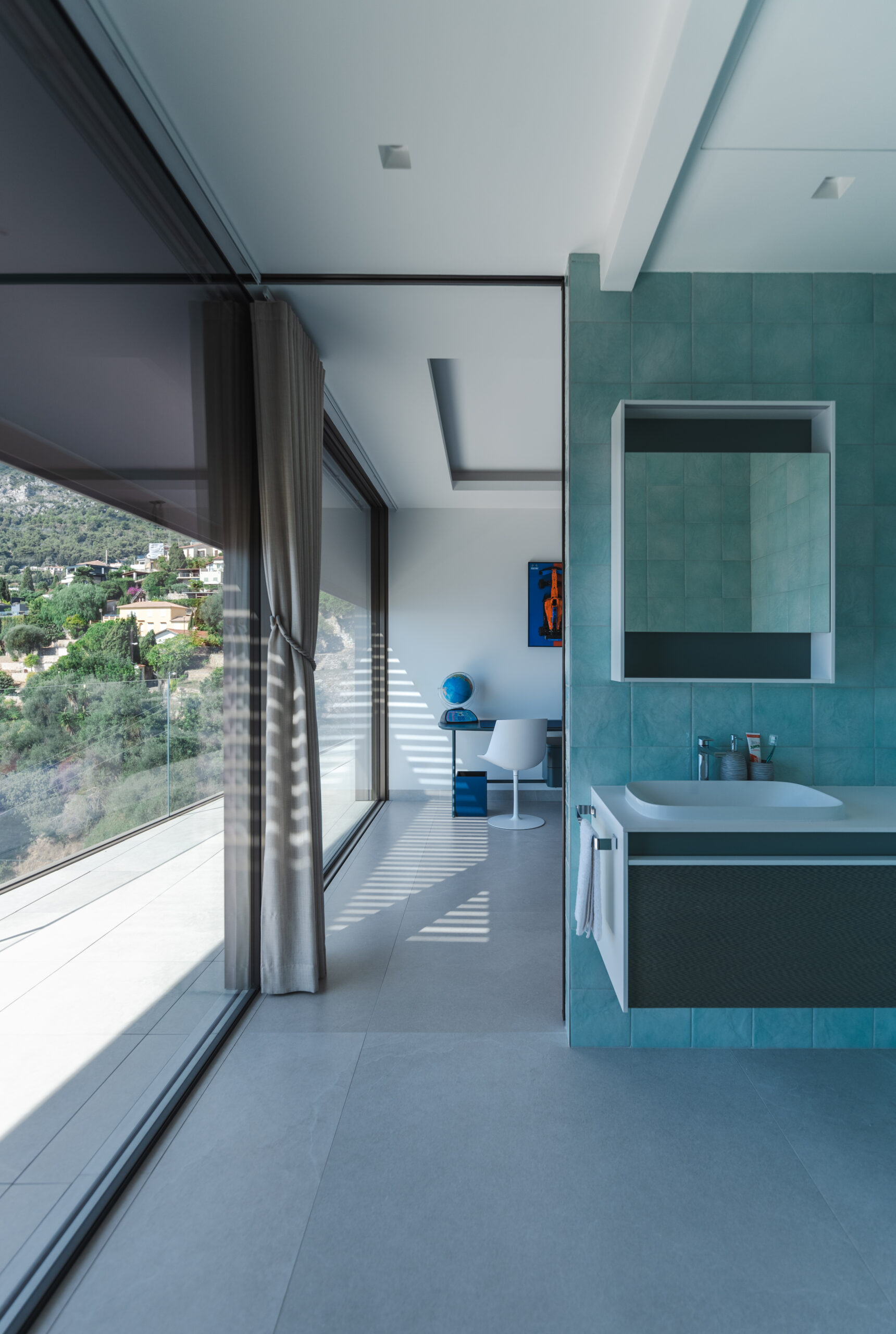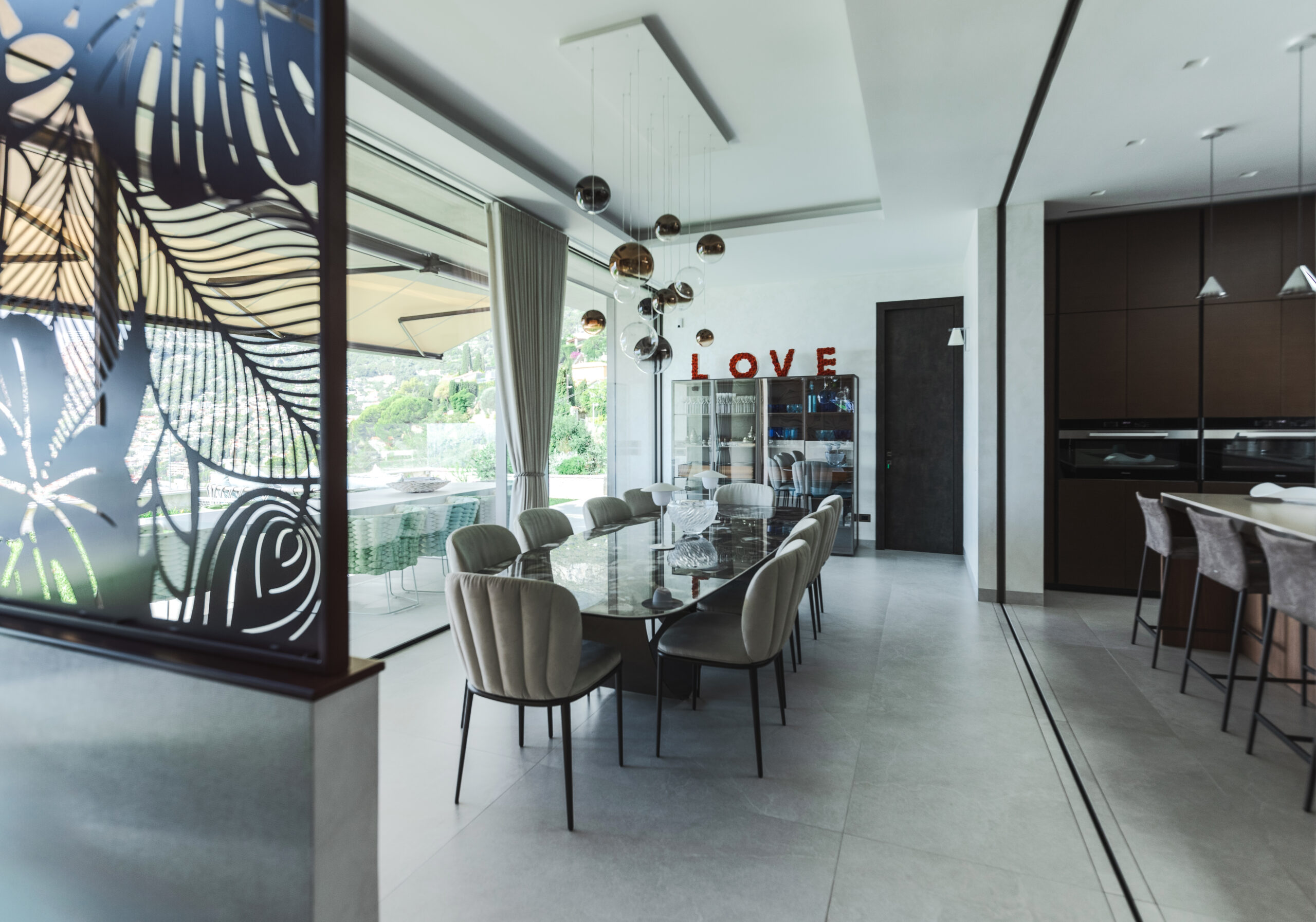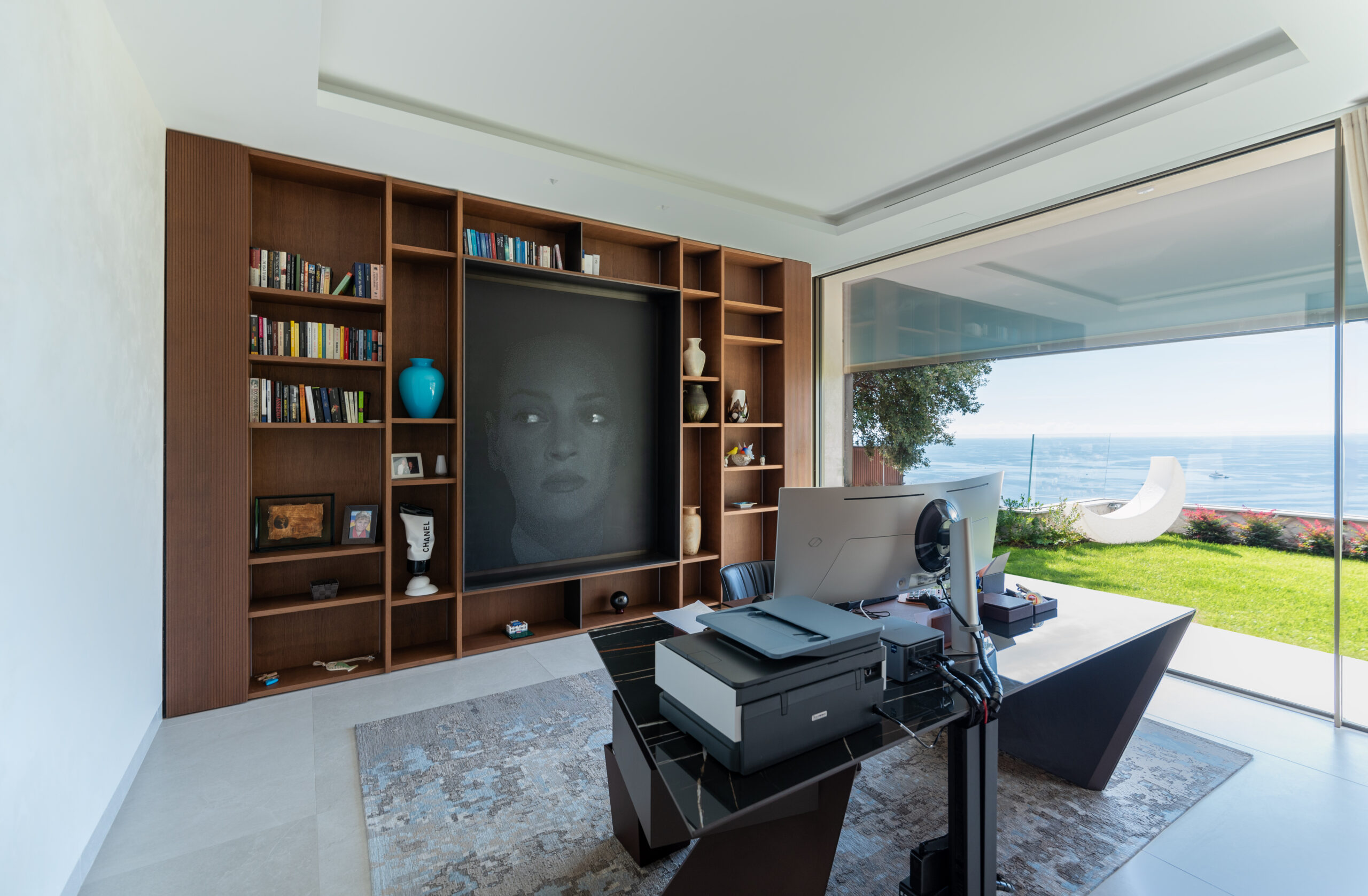 La planimetria interna segue la naturale conformazione dell’altipiano di Roquebrune Cap Martin, prediligendo uno sviluppo orizzontale e verticale che vede al piano “terra” un’ampia zona living correlata da uno spazio cucina e dining. L’arioso open-space di questi ambienti è inframmezzato da librerie in legno e da una imponente scala con pannelli in metallo traforati. I motivi vegetali di questo elemento vengono ripresi dalla carta da parati WallPepper in un armonioso duo di forma e colore.