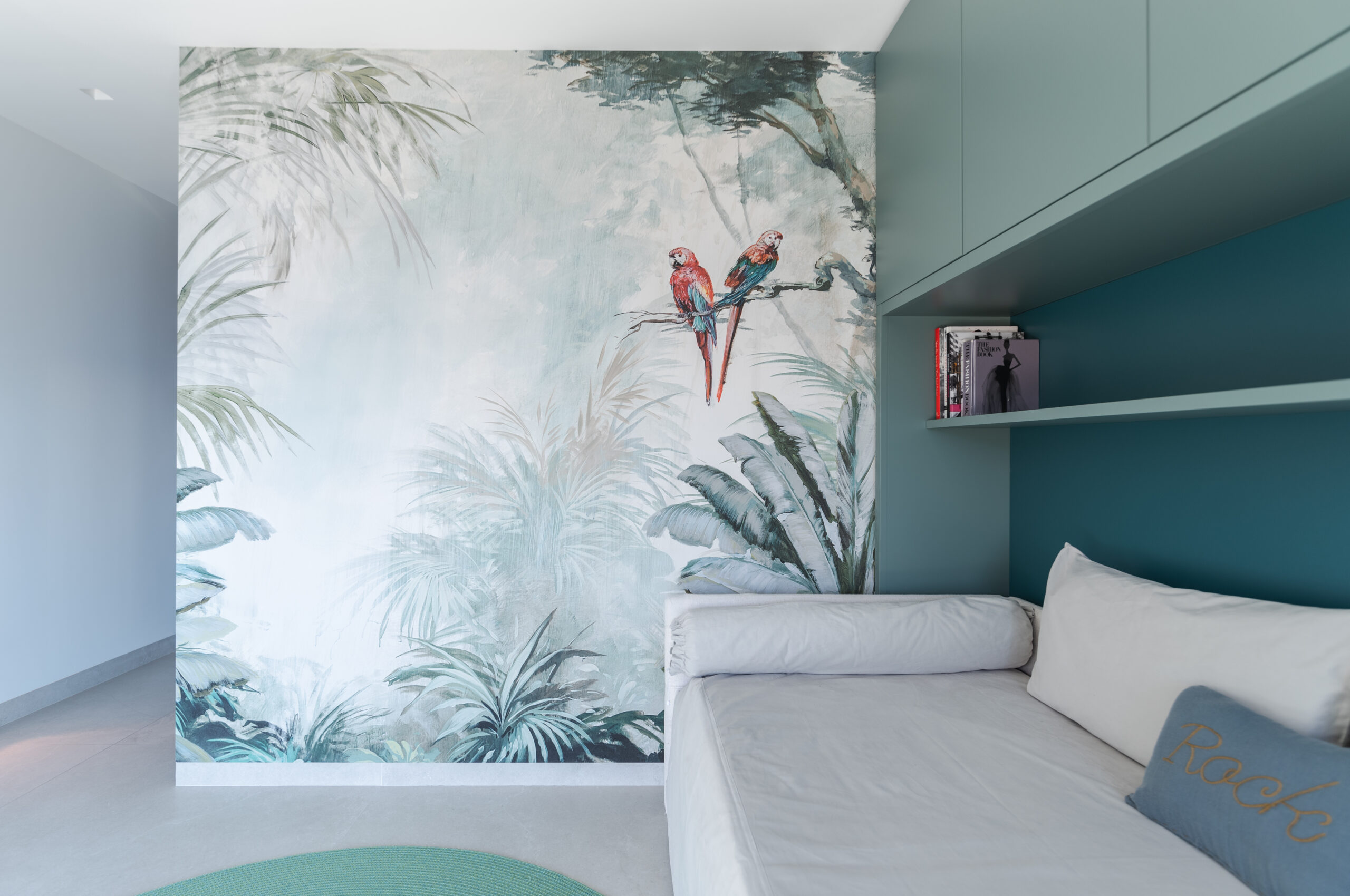 Carte da parati WallPepper e Roberto Molteni fanno da sfondo agli arredi Cassina, letti Flou e librerie Rimadesio coordinate. Una nota di pregio è rappresentata dalla cabina armadio Poliform della camera padronale, affacciata sull’ampio bagno con vasca idromassaggio e pareti in marmo.