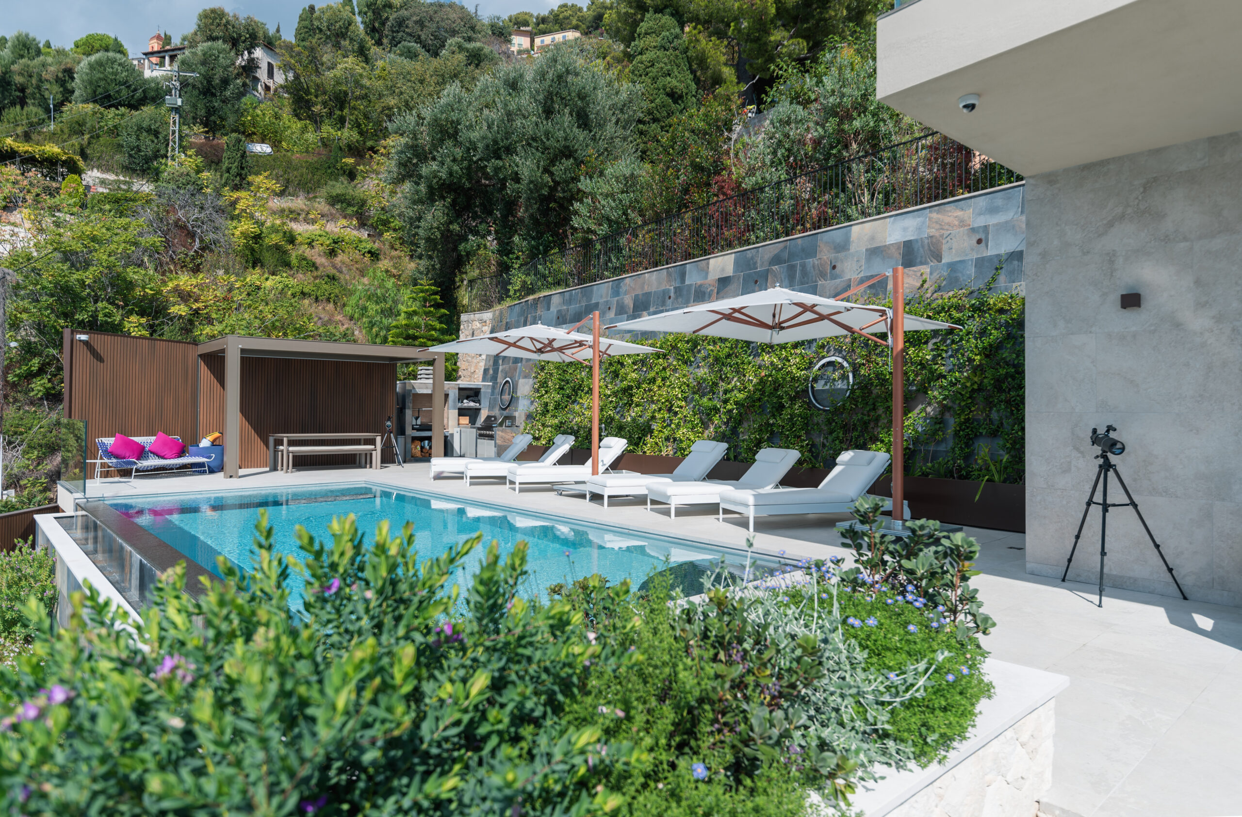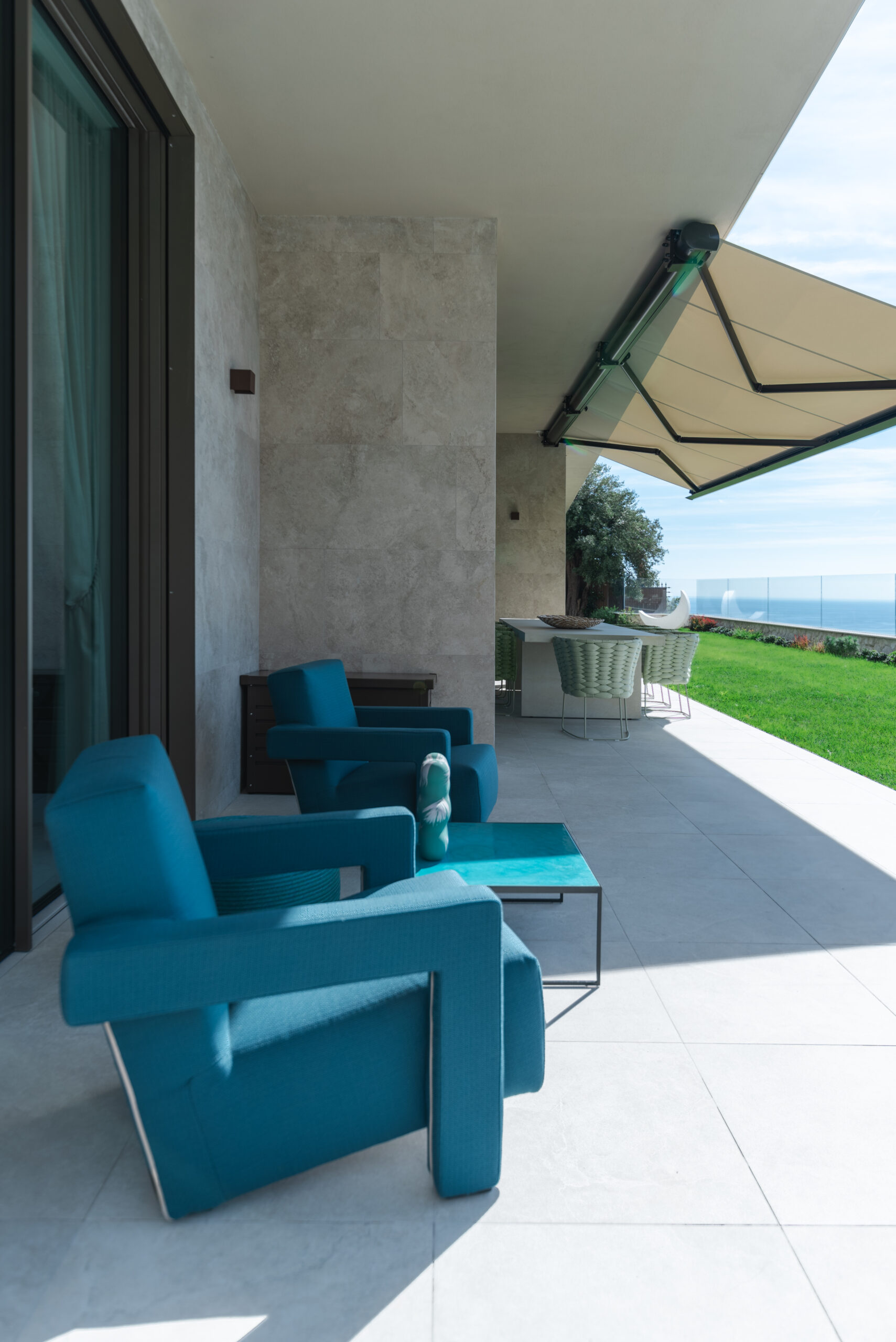 L’esterno di Villa Azzurra si allunga sul promontorio di Roquebrune Cap Martin in un susseguirsi di terrazzamenti a più livelli dai quali è possibile godere del panorama circondati dai massimi livelli di comfort. Tavoli e sedie Paola Lenti ritagliano un’area dining dalla quale si può accedere alla piscina a sfioro circondata da arredi outdoor Tuuci, Talenti e Tribu. Un pratico grill esterno e un solido braciere posto ai piedi di un divano Paola Lenti completano questo assortimento di elementi che tradiscono una passione per le serate trascorse all’aperto, riscaldate dal guizzante baluginio delle fiamme e insaporite da carni alla griglia. Il tutto ingentilito da qualche calice di buon vino.