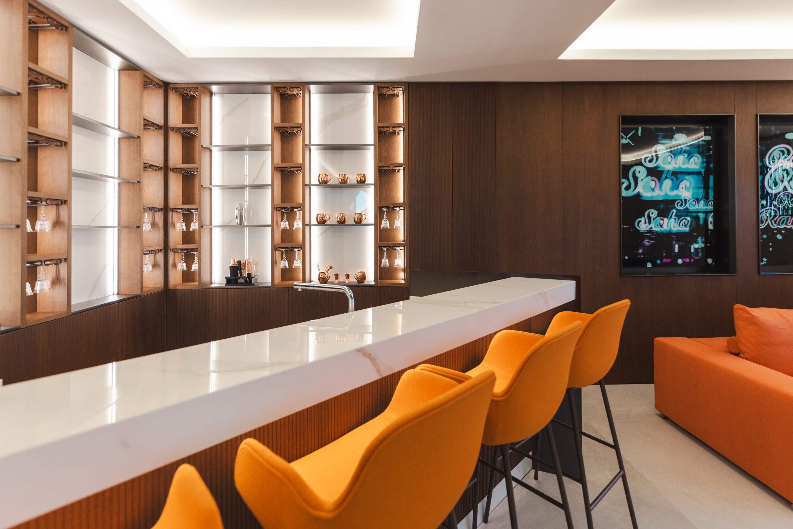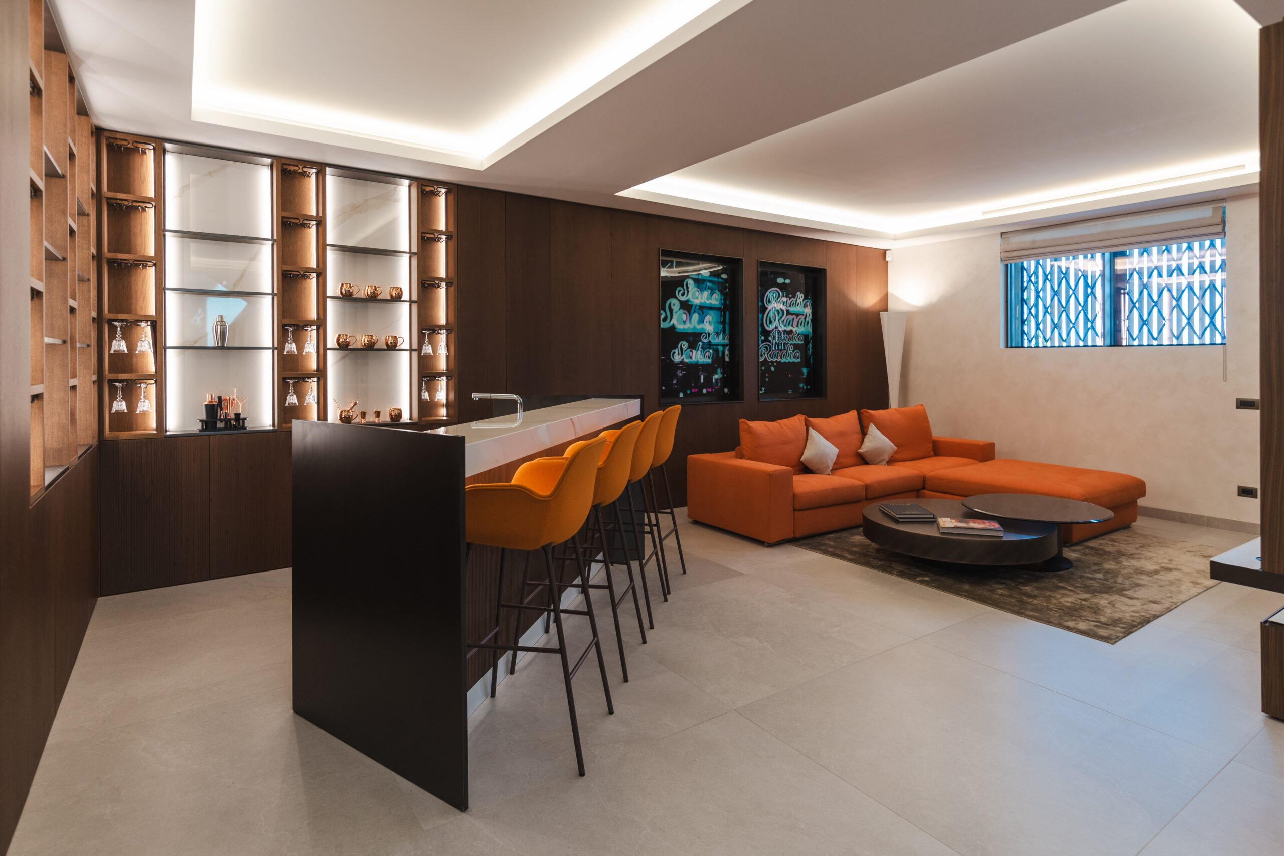 La taverna al piano sottostante, adibita a lounge bar, presenta un sofisticato mobile cocktail con sgabelli in tinte arancio, correlati a una zona relax dove un ampio divano Flexform si presta a postazione gaming.