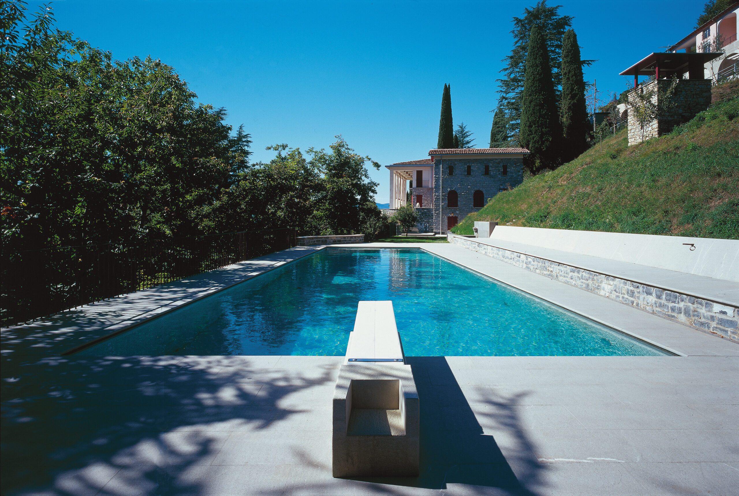 La facciata prospiciente il lago è stata personalizzata attraverso l’inserimento di ampi drappi di tessuto con funzione di tendaggi esterni per schermare la villa dal sole, sul modello dei vecchi tendoni delle ville d’epoca. Una lunga panca in teak realizzata dai nostri laboratori delimita e incornicia il porticato.