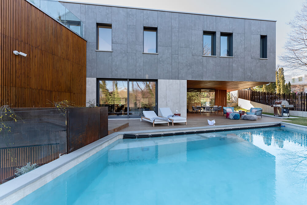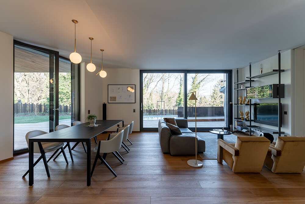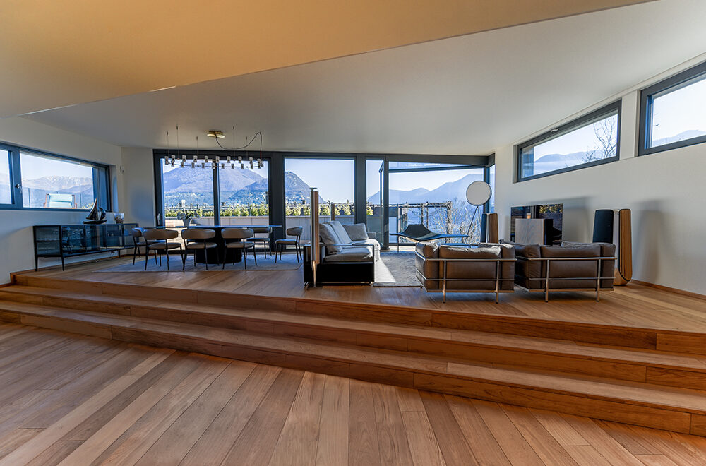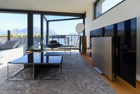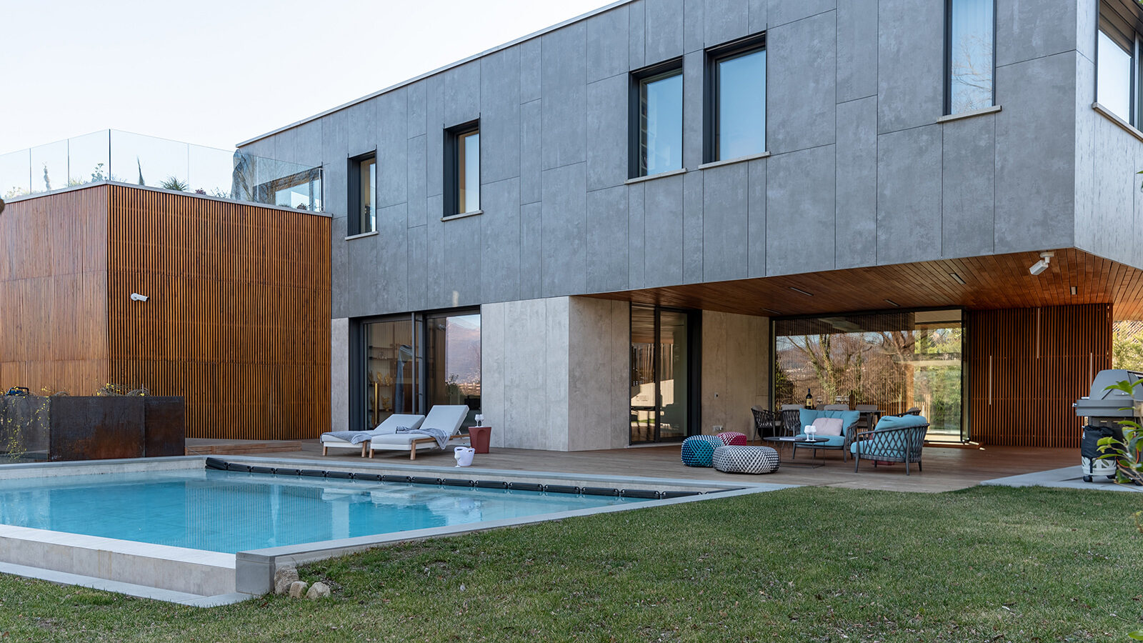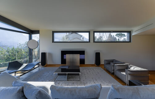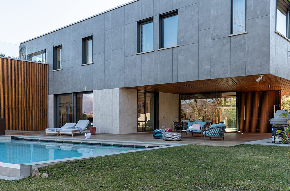 A poca distanza dal centro storico di Lugano, lungo un dolce pendio affacciato sul lago e circondato da rigogliosi alberi decidui, nasce una villa che sviluppa un’idea innovativa di architettura residenziale, nata dalla collaborazione tra un pool di investitori svizzeri e gli architetti Pier Massimo Cinquetti e Benedetto Camerana. L’edificio è caratterizzato da forme geometriche semplici, interne ed esterne, che risolvono armoniosamente il dialogo con la natura circostante attraverso l’utilizzo di materiali tipici dell’architettura della zona del Ticino e ampie superfici vetrate per enfatizzare la vista verso il lago e il bosco.