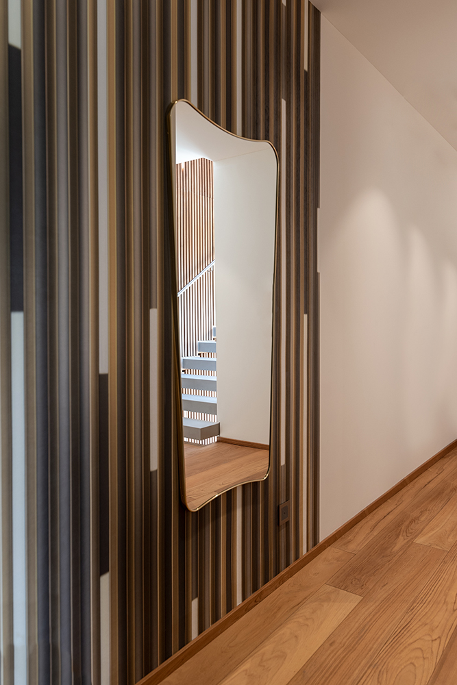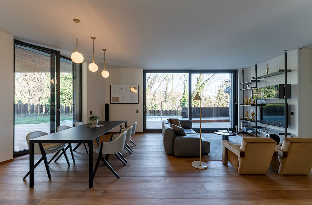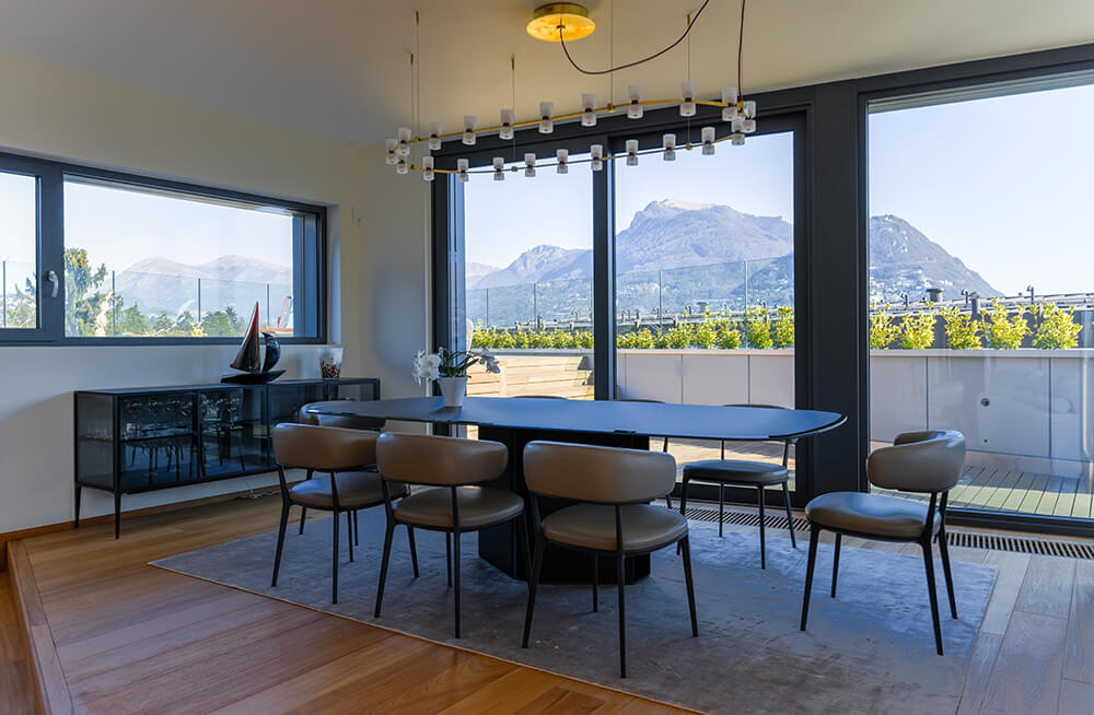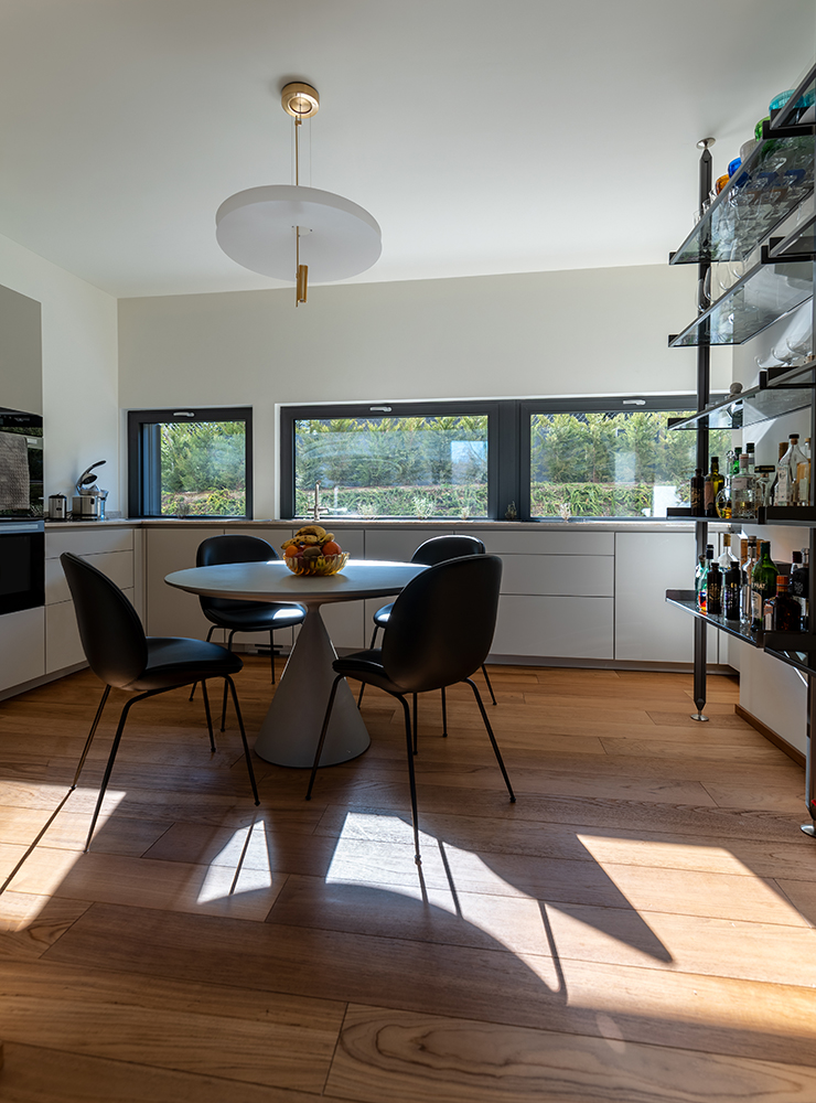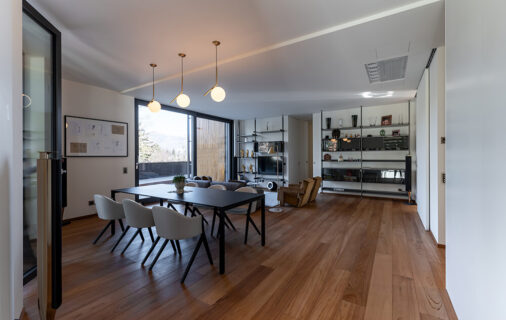 Per l’arredo della zona giorno del piano terra sono stati selezionati alcuni pezzi del marchio Cassina, caratterizzati da uno stile distintivo e potente. Il sistema Zenit di Rimadesio incornicia l’elegante area living, oltre la quale si estende la zona notte. Lo spazio cucina ospita un tavolo Desalto e sedie Gubi, ideali per un ambiente più intimo e familiare. Un assortimento di lampade Flos crea armoniosi punti luce accanto agli imbottiti e sopra il tavolo Cassina.
