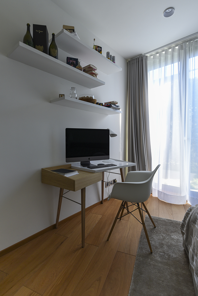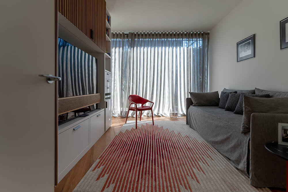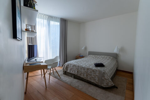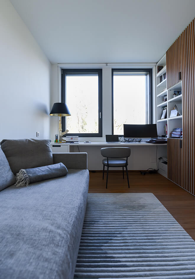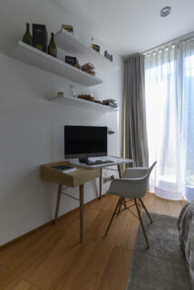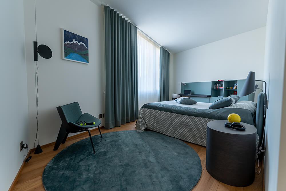 Le camere da letto ospitano numerose scelte estetiche d’alta gamma come letti Flou, sedie Vitra e comodini Maxalto. Una scrivania di Ligne Roset e un vanity di Baxter Made in Italy completano le composizioni create non solo per la stanza padronale, ma anche per quelle di figli e ospiti dove è possibile apprezzare virtuosismi stilistici come una poltrona Herman Miller e una graziosa composizione Lema.