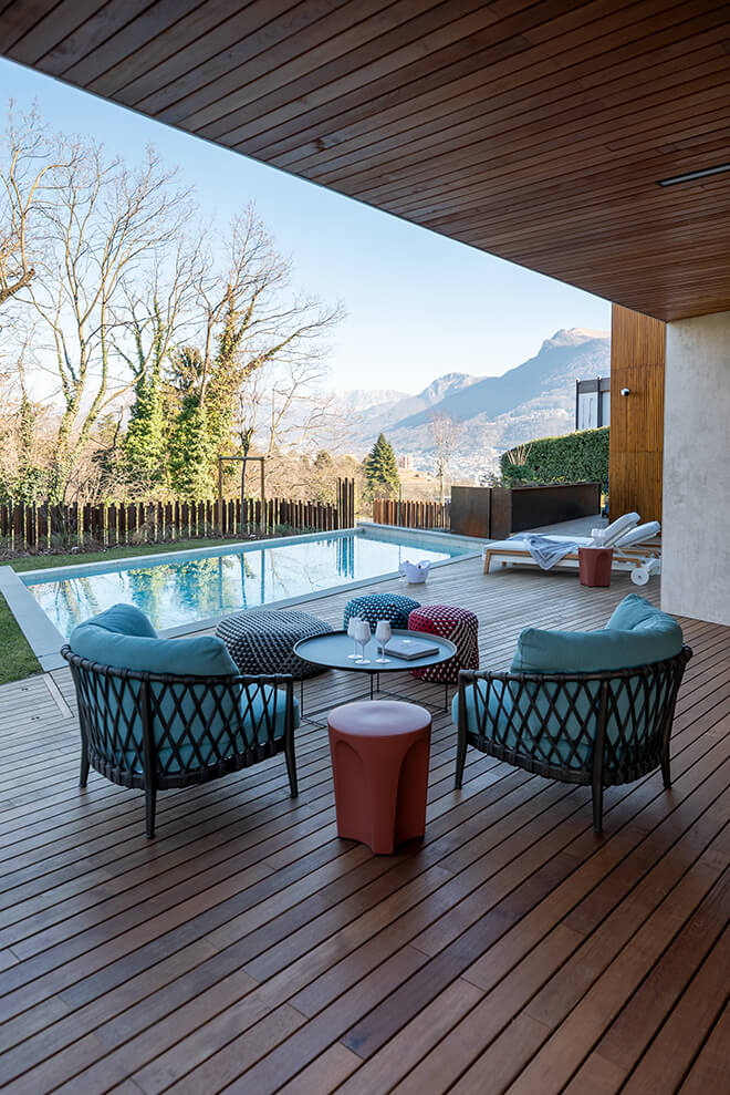 All’esterno, il giardino privato parla un linguaggio coerente con la natura circostante e cinge e dona privatezza assoluta alla piscina. In questo contesto dominato dall’ampia vista e dalla sensazione di intimità sono state collocate poltrone e pouf di B&B Italia dai colori vivaci oltre a due lettini Paola Lenti a bordo piscina.