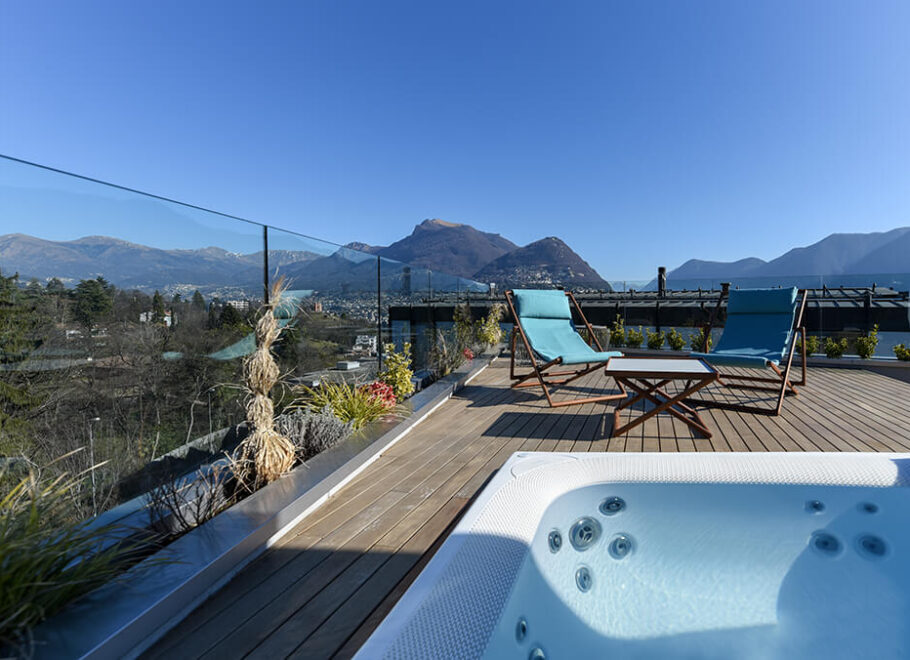 Dall’ampia area giorno si accede a un terrazzo adibito a solarium, dove una vasca idromassaggio e una coppia di sdraio Paola Lenti invitano a concedersi un po’ di svago all’aria aperta. Da qui il paesaggio offre il suo spunto migliore, permettendo alla vista di spaziare fra colline e paesaggi mozzafiato a ogni ora del giorno e della notte.