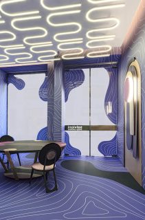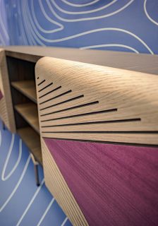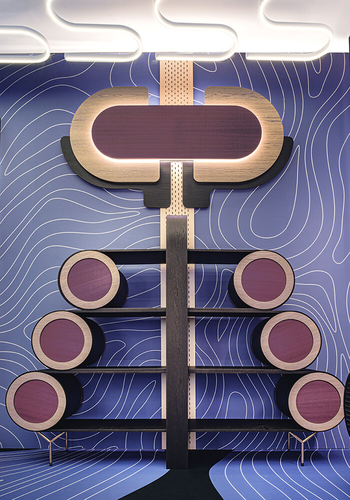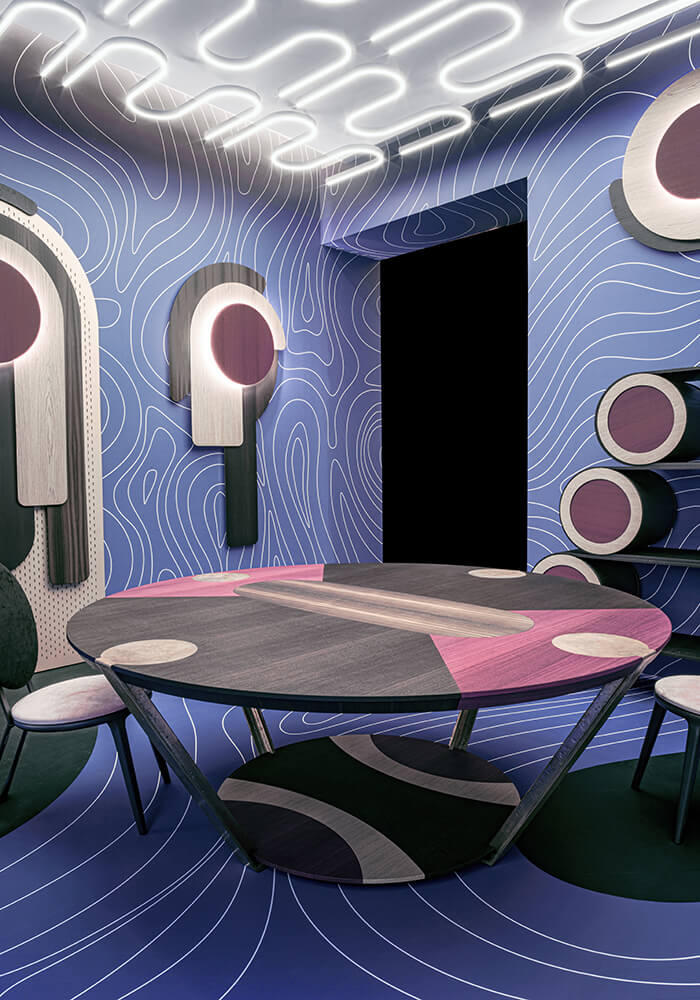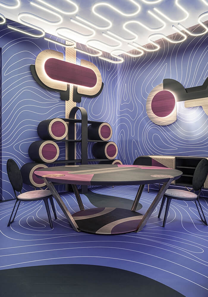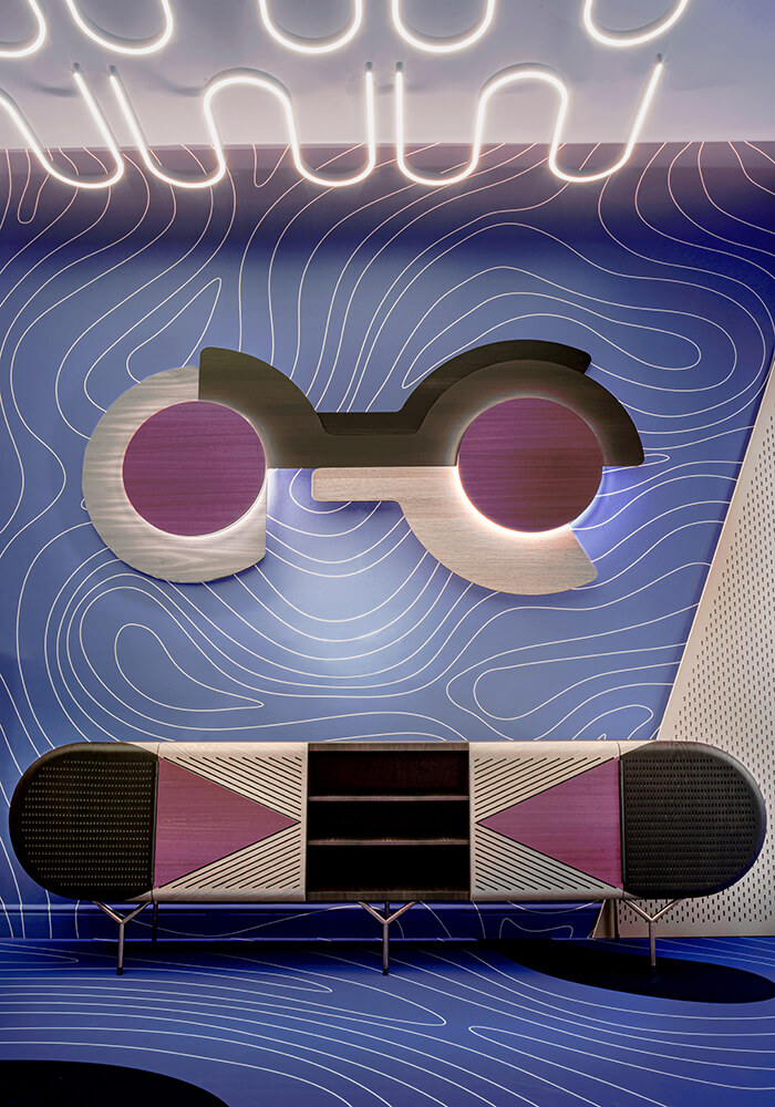Alle pareti, il legno prende vita sotto forma di oggetti ibridi che mescolano sapientemente luce e tridimensionalità, originando elementi totemici, carichi di citazioni dal gusto futuristico e un po’ retrò. Anche a soffitto, tubi di luce dalle sinuose sagome producono incursioni cromatiche che modificano la comprensione dello spazio, in questo caso un living, inteso nel senso più classico.
