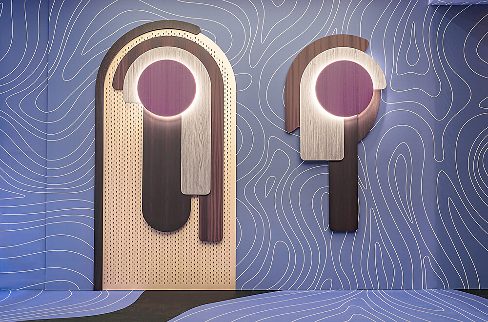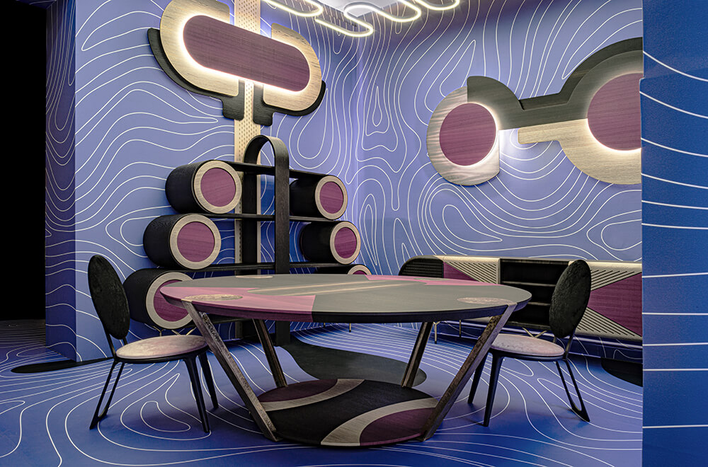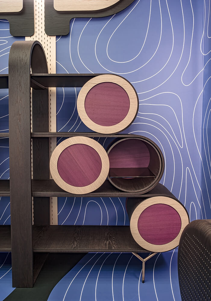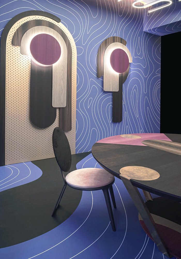 In questo nuovo spazio, il visitatore è invitato a inoltrarsi in una dimensione astratta e surreale dove forme, colori e materiali dominano la scena in un intreccio di sensazioni. Nel blu e viola dello sfondo, emerge qui la collezione Orbis di Emmemobili®, composta dal tavolo Atlas, la libreria Roue e la madia Mirar, dove concetti filosofici legati alla natura e al sacro si intrecciano a un uso magistrale delle materie prime come legno e metallo, fuse di intrecci ed essenze di grande impatto.